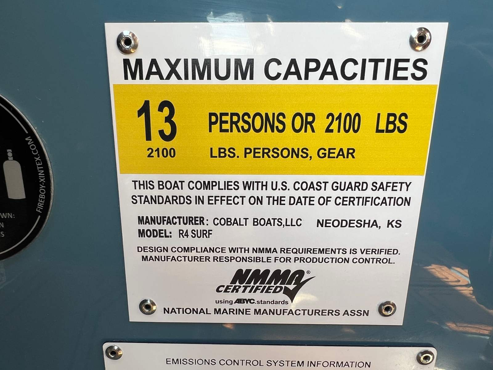 The 2026 Cobalt R4 Surf is packed with special features that set it apart from other boats in its class. The Bayside Blue upper surf accent and surf mid hull side, paired with the rich ebony accent stripe and hull bottom, give this boat a distinctive and eye-catching appearance. The swim platform extension in rich ebony provides extra space for relaxing, gearing up for water sports, or simply enjoying the view. Inside, the caramel, carbon, and ebony interior creates a welcoming and upscale atmosphere for you and your guests.The aft-facing rumble seat is a standout feature, offering a comfortable spot to watch the action behind the boat or to simply relax and soak up the sun. The battery maintainer/charger ensures your boat is always ready for your next adventure, while the Cobalt letters in black satin add a touch of elegance and brand prestige.