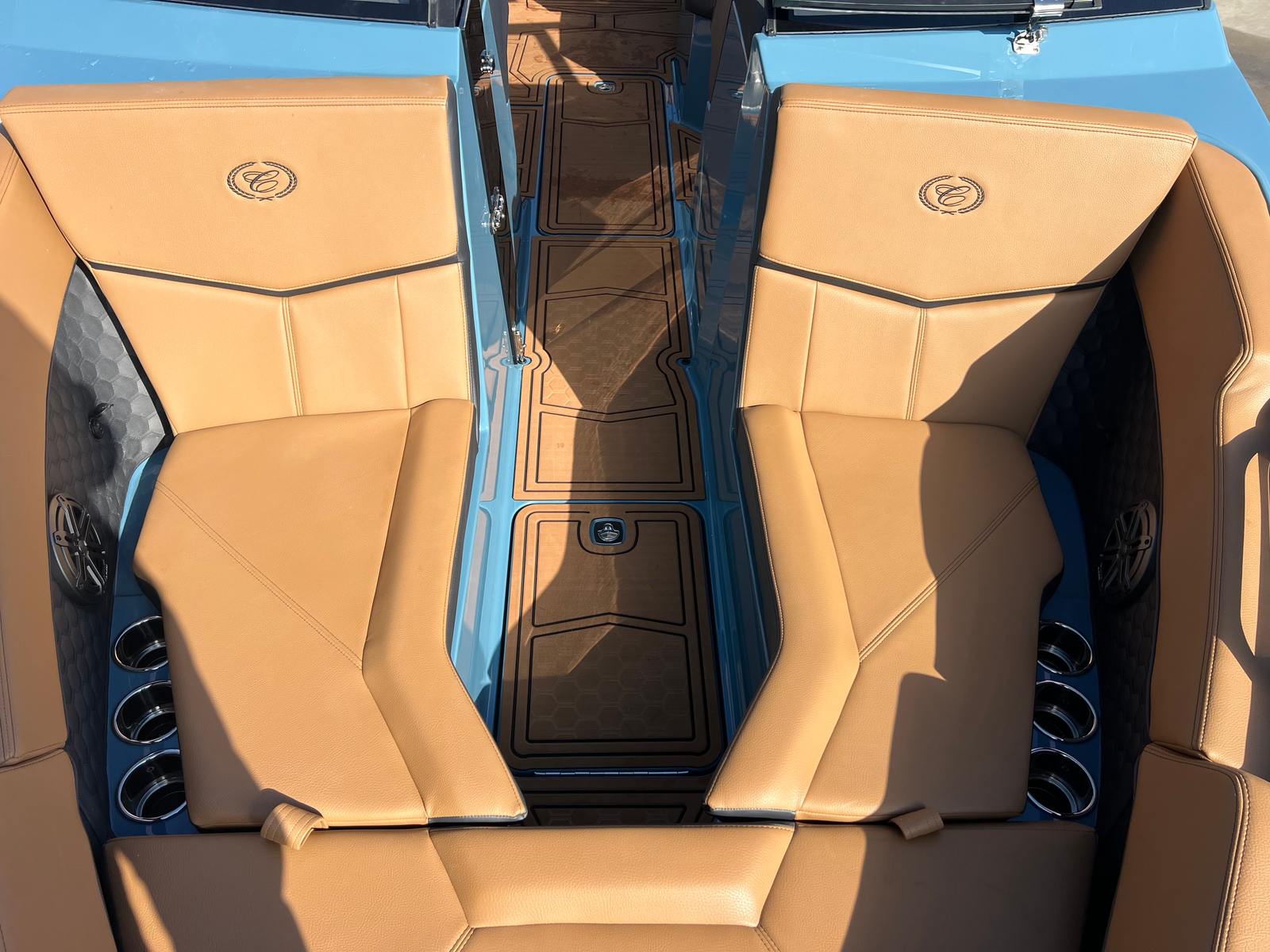 The 2026 Cobalt R4 Surf is a 24.25-foot bowrider that stands out with its sleek lines and modern design. As a brand-new model, it showcases the latest innovations in boating technology and style. The R4 Surf’s Bayside Blue upper surf accent and surf mid hull side, complemented by a rich ebony accent stripe and hull bottom, create a striking visual presence on the water. The swim platform extension in rich ebony further enhances both the look and functionality of this remarkable vessel. Step aboard and you’ll immediately notice the sophisticated interior, featuring a harmonious blend of caramel, carbon, and ebony tones, ensuring every journey is as comfortable as it is stylish.