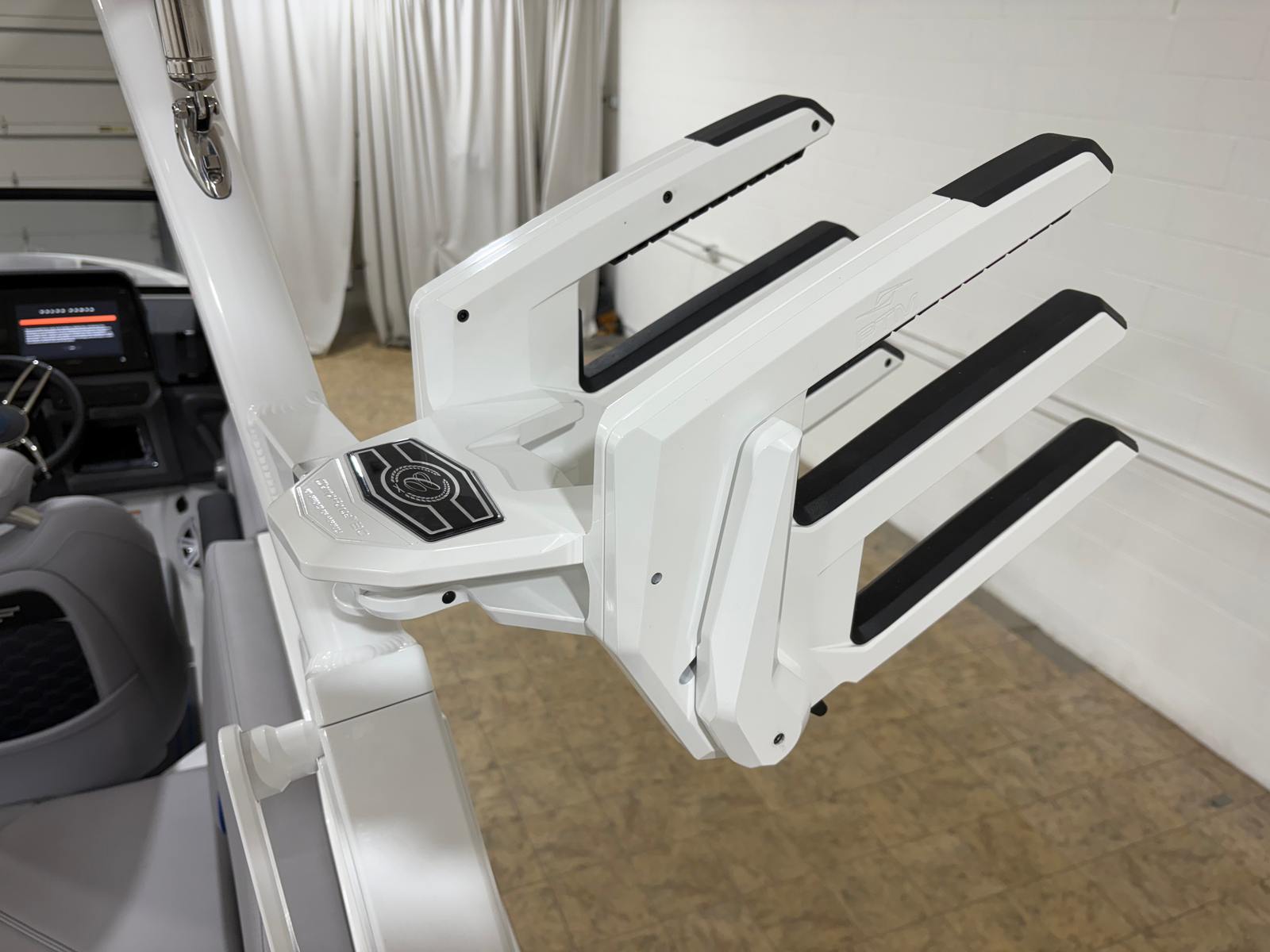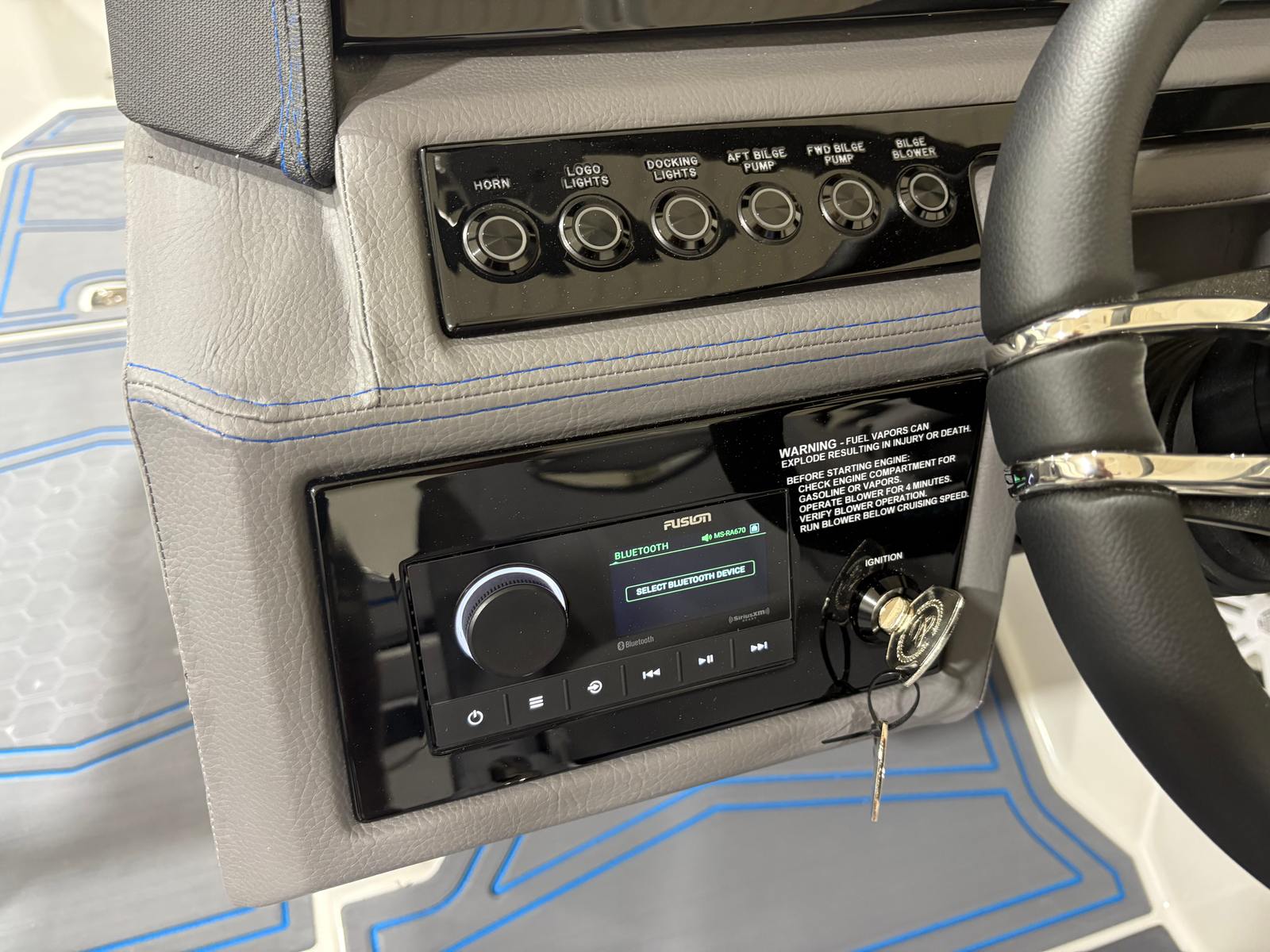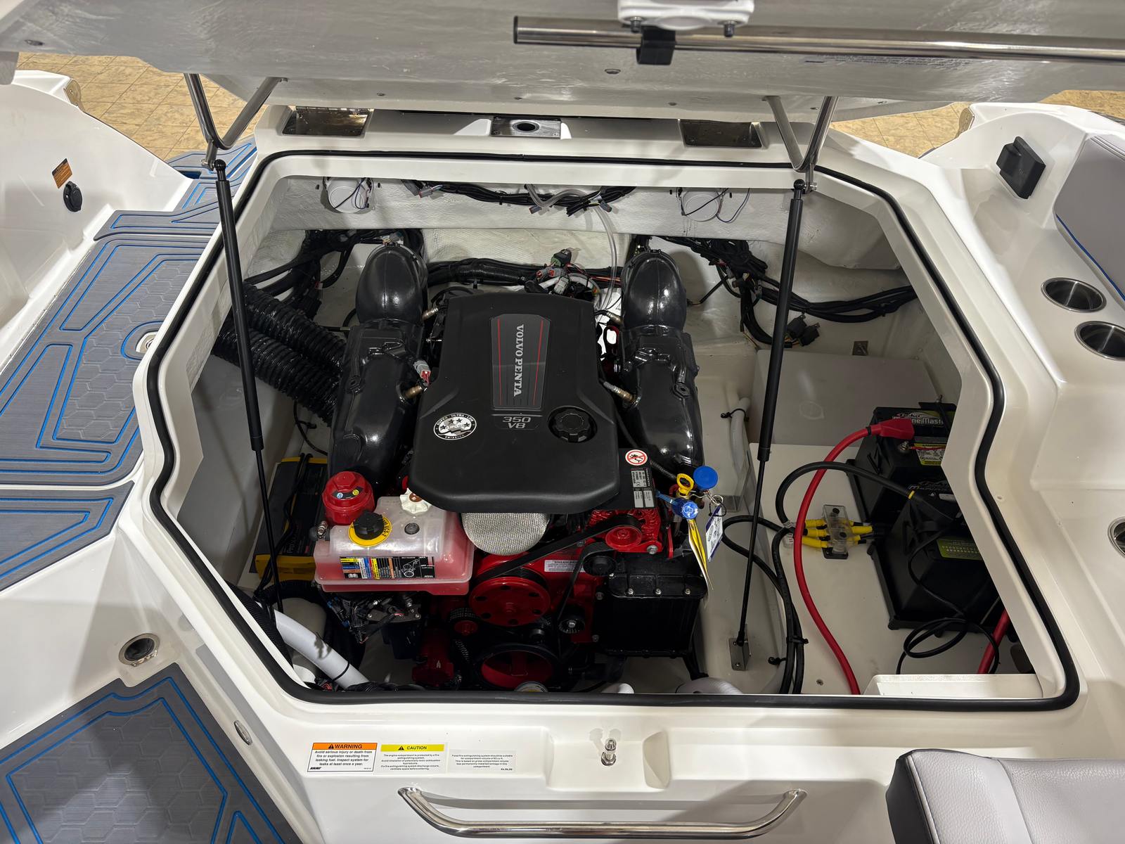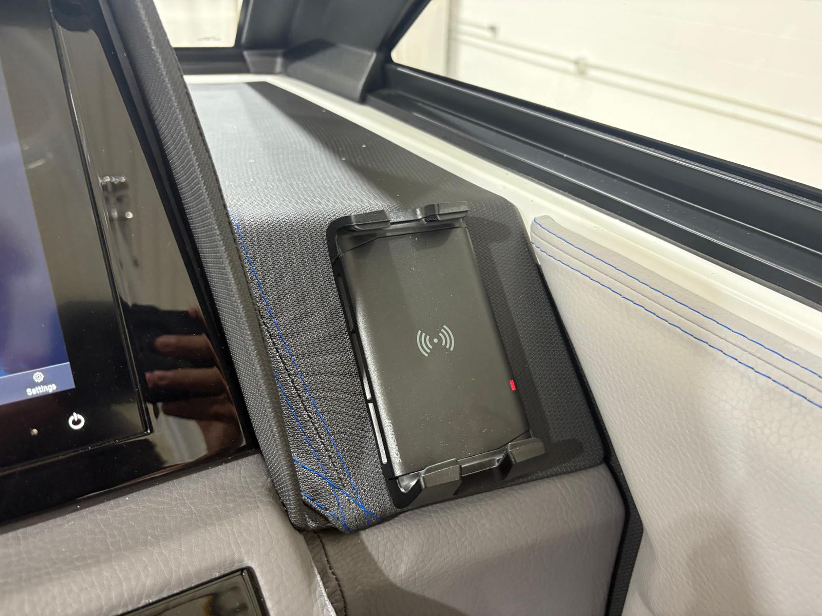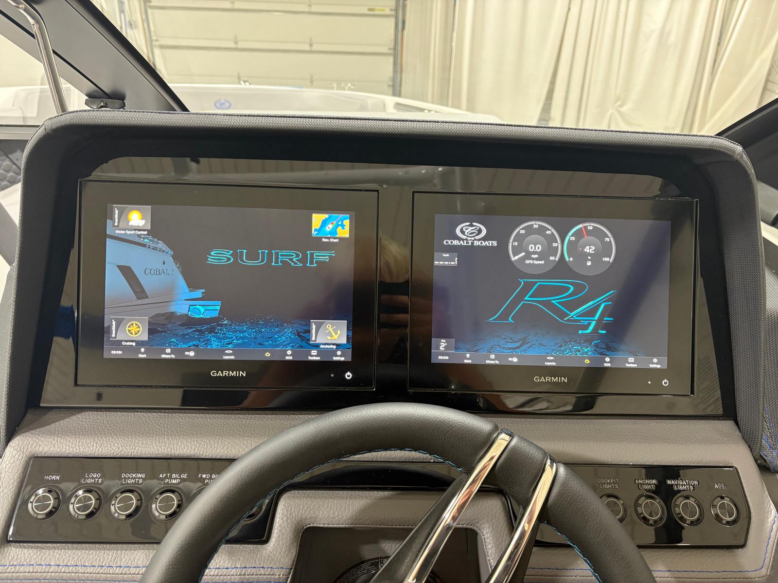 The Cobalt R4 Surf is loaded with special features that enhance both functionality and enjoyment. The aft-facing rumble seat provides a comfortable spot to relax and take in the action behind the boat, making it perfect for socializing or watching water sports. The battery maintainer/charger (110V) ensures your boat is always ready for adventure, while stainless steel docking lights offer both style and safety during evening outings. Fender clips with lines (4) make securing your boat at the dock quick and hassle-free.Inside, the Frost/Slate/Pacific Blue interior is complemented by LED interior accent lighting with customizable R/G/B colors, creating an inviting and vibrant atmosphere for day or night cruising. The glass cockpit, featuring dual Volvo 8610 displays, delivers cutting-edge navigation and system monitoring at your fingertips. The mooring cover with E2 folding arch provides protection and convenience, allowing you to easily cover your boat when not in use.