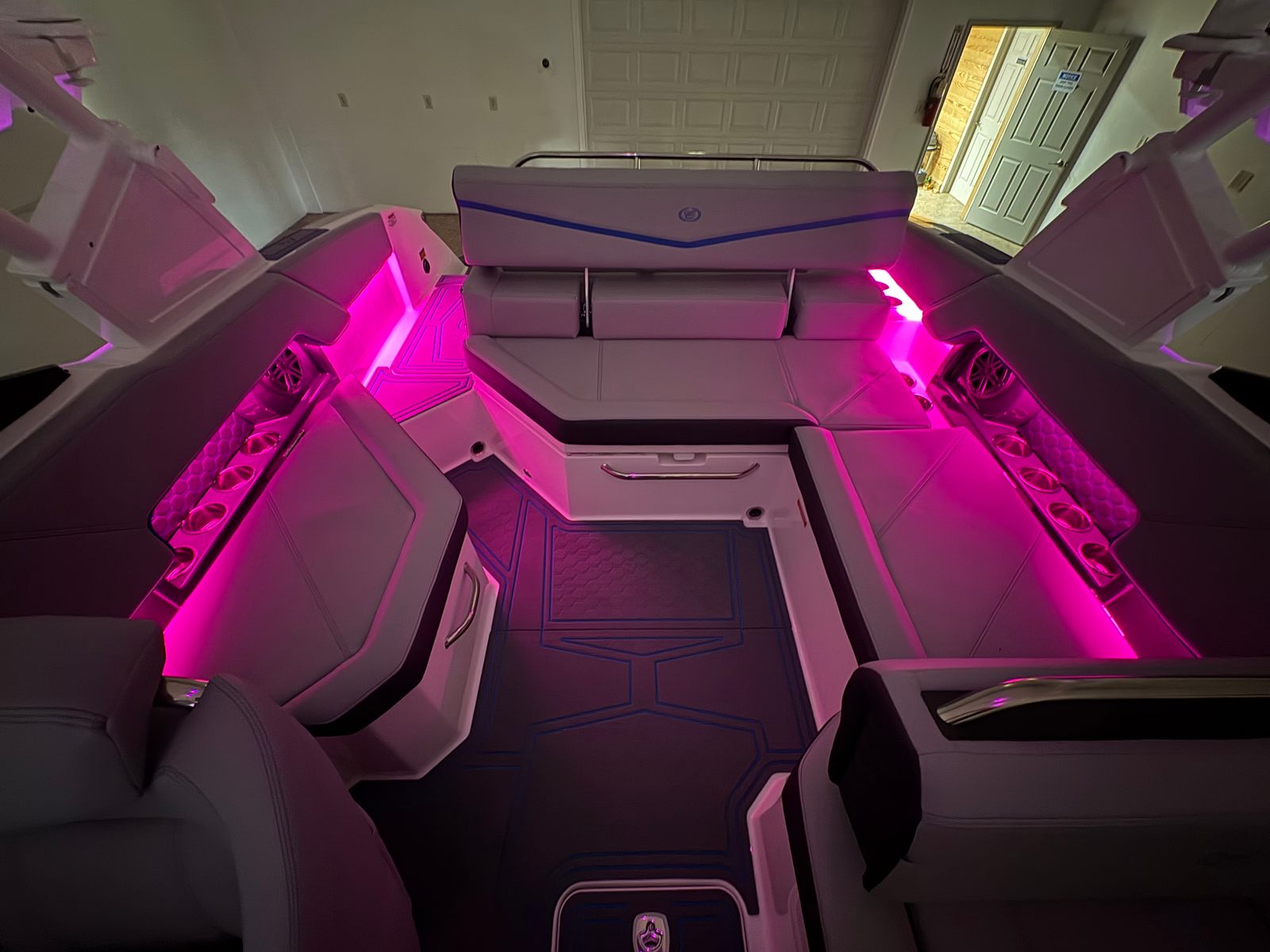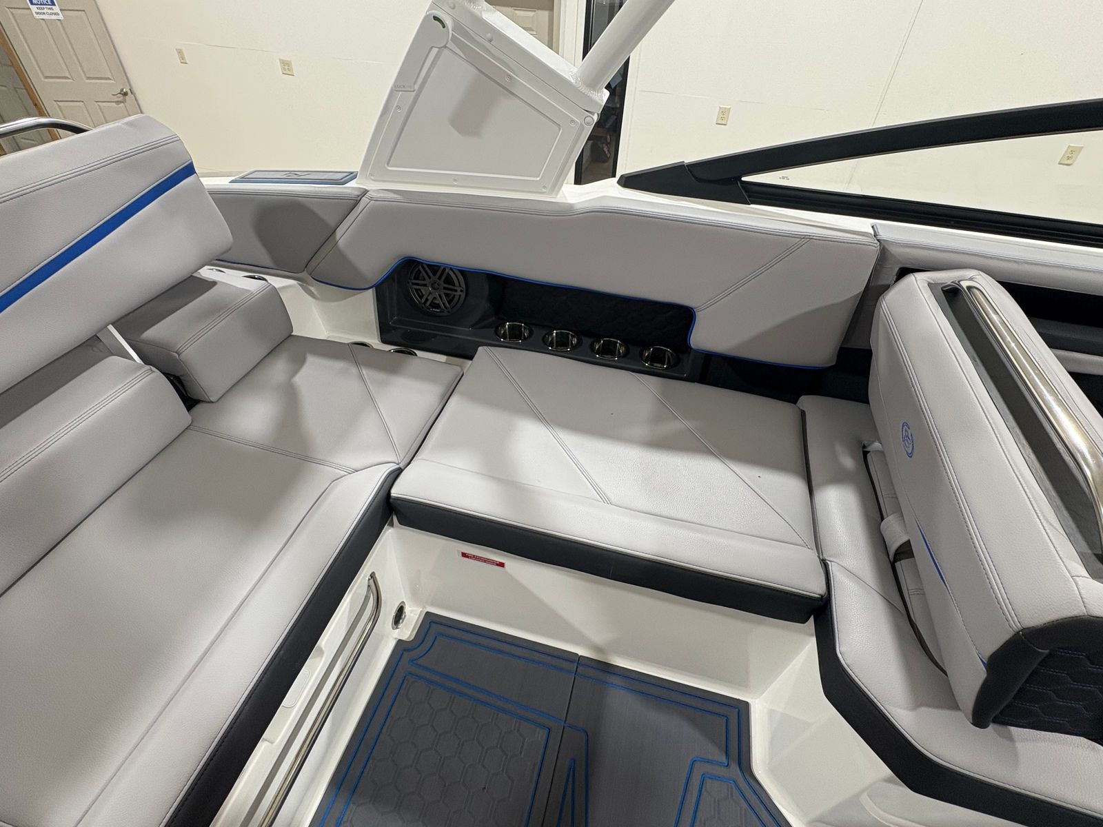 The Cobalt R4 Surf is as practical as it is fun. The battery maintainer/charger keeps your systems powered and ready, reducing maintenance worries and maximizing your time on the water. Stainless steel docking lights and fender clips simplify the docking process, making it easier to secure your boat safely and efficiently. The mooring cover with E2 folding arch offers added protection from the elements, helping to preserve your boat’s pristine condition.The spacious interior provides ample storage for gear, water toys, and personal items, keeping the deck clutter-free and organized. The intuitive glass cockpit with dual Volvo 8610 displays streamlines navigation and system management, allowing you to focus on enjoying your time on the water. Whether you are an experienced boater or new to the lifestyle, the R4 Surf’s user-friendly features make ownership a breeze.