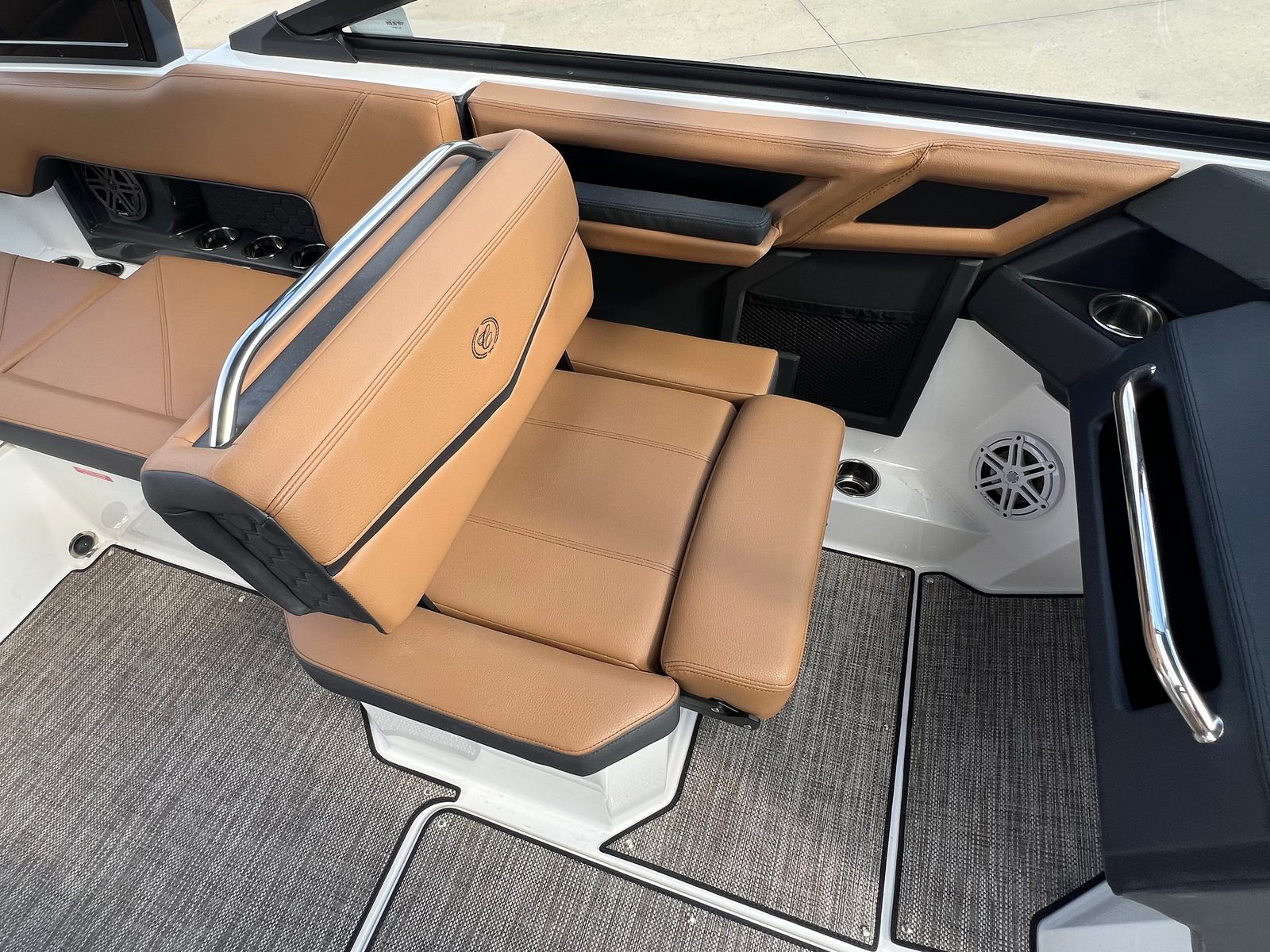The 2026 Cobalt R4 Surf is packed with special features that enhance both its aesthetic appeal and functional capabilities. The Volvo V8 350CE DP engine is complemented by a sophisticated Glass Cockpit with dual Volvo 8610 displays, providing intuitive control and real-time information at your fingertips. The aft-facing rumble seat offers a unique vantage point for relaxing or socializing, while the caramel, carbon, and ebony interior creates a warm and inviting atmosphere.Practical touches like the battery maintainer/charger (110V) ensure your boat is always ready for action, and the stainless steel docking lights make nighttime arrivals and departures safe and stylish. Fender clips with line (four included) simplify the docking process, and the floor covering in seagrass raw umber adds both comfort and durability underfoot. The hull bottom in ebony and Cobalt letters in white satin complete the look, giving the R4 Surf a distinctive and elegant presence on the water.