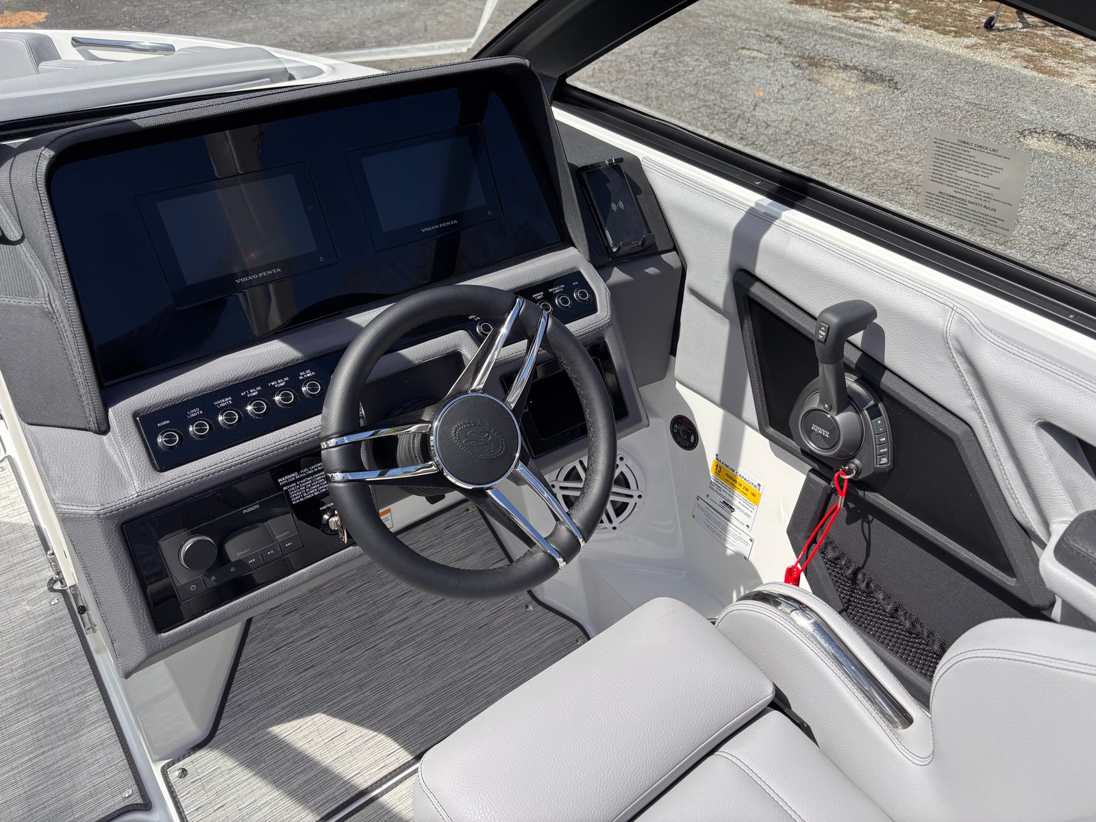 The 2026 Cobalt R4 Surf is packed with premium features designed to enhance your boating experience. The battery maintainer/charger (110V) keeps your boat ready for action, while stainless steel docking lights ensure safe and stylish arrivals at any marina. Four fender clips with lines make docking and mooring effortless, and the seagrass floor covering in Silver Ash adds a touch of elegance and comfort underfoot. The LED interior accent lighting, with customizable R/G/B options, sets the perfect mood for any occasion, whether you’re hosting friends or enjoying a quiet evening on the water.The mooring cover with E2 folding arch offers protection and convenience, keeping your boat in pristine condition when not in use. The glass cockpit, featuring dual Volvo B7XSV displays, provides cutting-edge navigation and system monitoring, ensuring you stay informed and in control at all times.