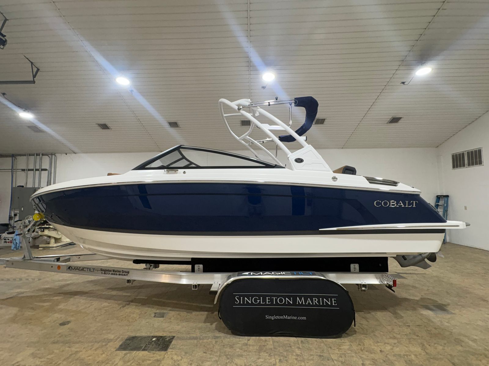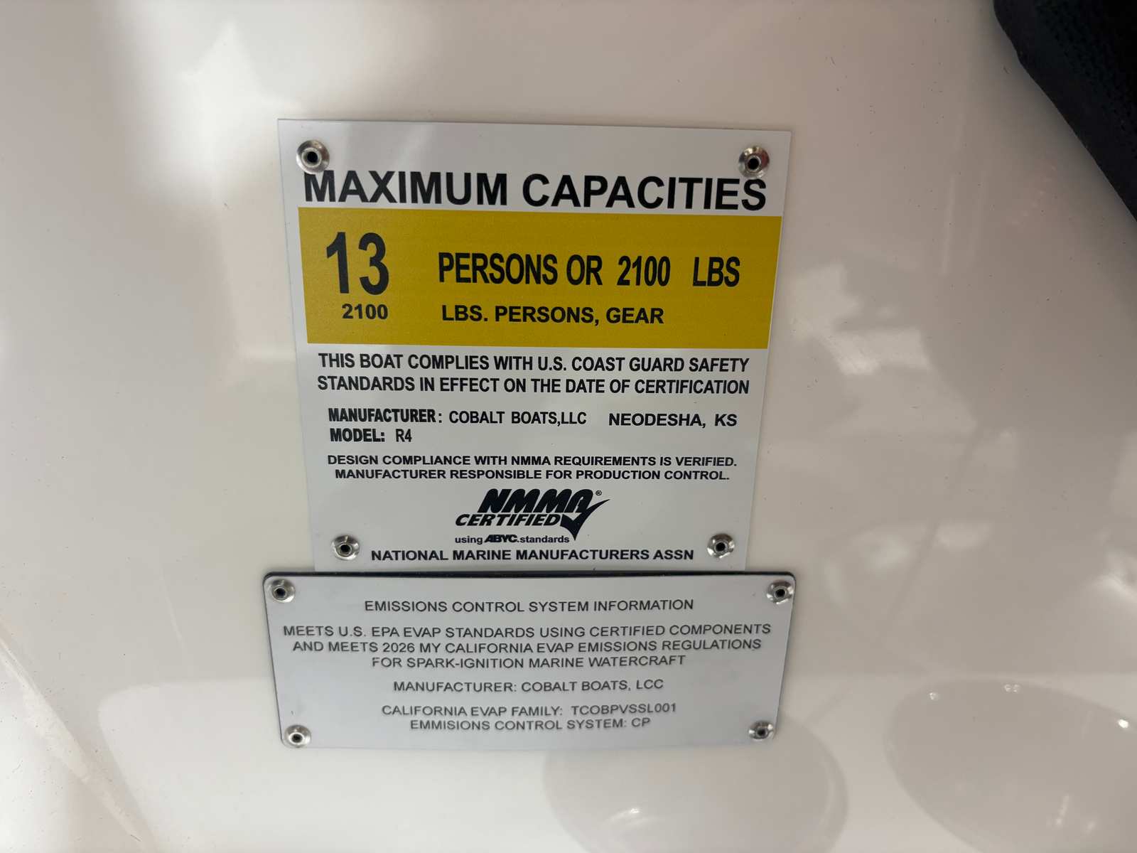 The Cobalt R4 is designed with practicality in mind, making ownership easy and enjoyable. The folding arch and bimini provide flexible shade options and make it easier to store or transport the boat. Fender clips with lines simplify the docking process, ensuring your boat is secure and protected when you arrive at your favorite waterfront destination. The stainless steel docking lights improve safety during low-light conditions, while the durable Seagrass flooring is both stylish and easy to maintain. With its efficient Volvo V8 engine, the R4 offers a balance of power and fuel economy, so you can maximize your time on the water without worrying about frequent refueling stops.