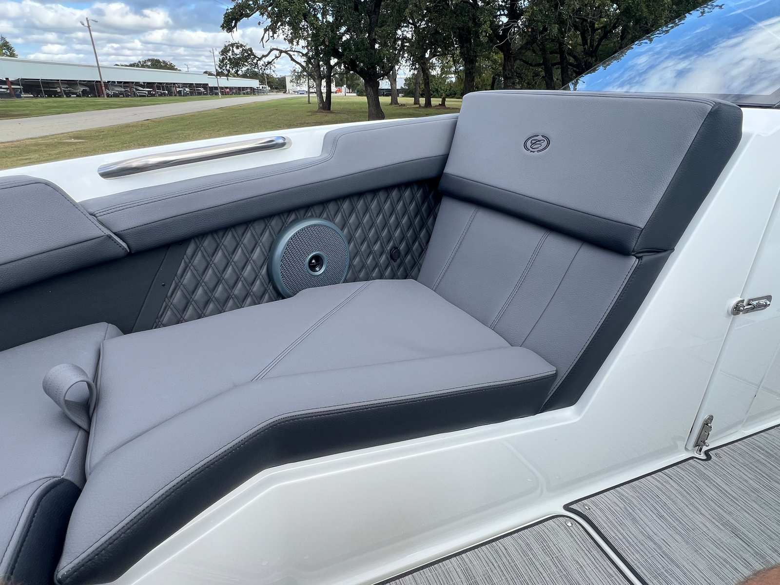 The Cobalt R4 Bowrider is designed with practicality in mind, offering features that make ownership both easy and enjoyable. The battery maintainer/charger keeps your boat’s electrical system in top condition, reducing maintenance hassles and ensuring reliable starts every time. The air compressor with holder is a handy addition for inflating water toys, paddleboards, or other equipment, making it simple to switch between activities.Stainless steel docking lights enhance safety and convenience during nighttime docking, while the electric adjustable seat allows for effortless customization to suit your preferences. The bow filler cushions and aft-facing rumble seat provide flexible seating arrangements, accommodating different group sizes and activities. The solid teak dinette table adds a touch of elegance and practicality, creating a perfect spot for meals or games on the water.