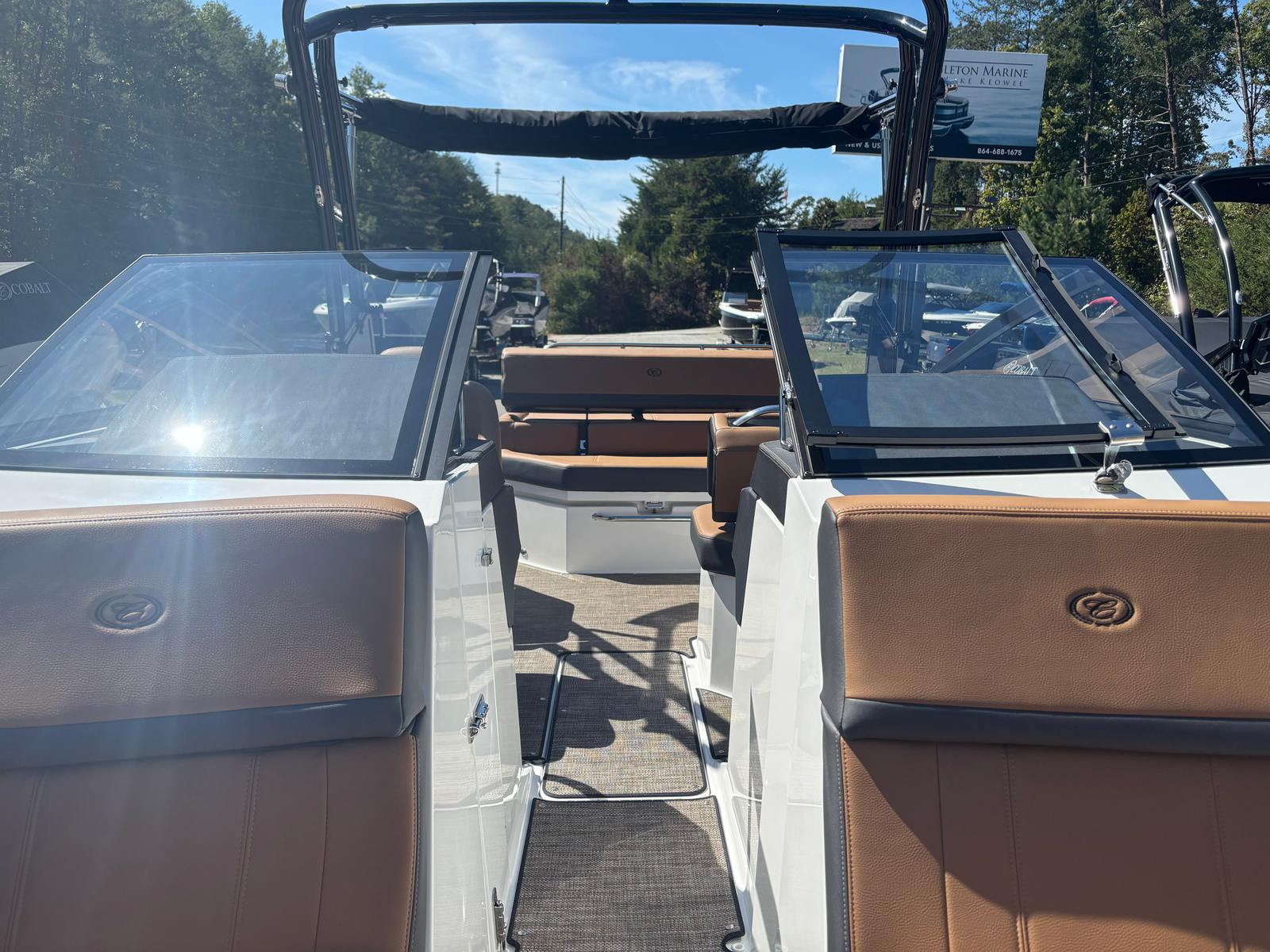 The Cobalt R4 is loaded with premium features that enhance both functionality and enjoyment on the water. Stainless steel docking lights offer superior visibility and safety during low-light conditions, making docking and nighttime navigation a breeze. The automatic fire extinguisher system provides peace of mind, ensuring safety is always a top priority.A standout feature is the Arch, E2, Black (Folding) with Bimini—Ebony, which combines sleek aesthetics with practical sun protection. The folding design allows for easy storage and adaptability, while the Bimini top offers shade on sunny days. The black leather and stainless steel steering wheel adds a touch of sophistication to the helm, complementing the boat’s modern interior.The floor covering, crafted from Seagrass in a Raw Umber finish, delivers both comfort and durability, creating a welcoming environment for barefoot relaxation. The mooring cover protects your investment from the elements, while the folding arch adds versatility for storage and transport. LED interior accent lighting in red, green, and blue creates a customizable ambiance, perfect for evening cruises or entertaining guests.