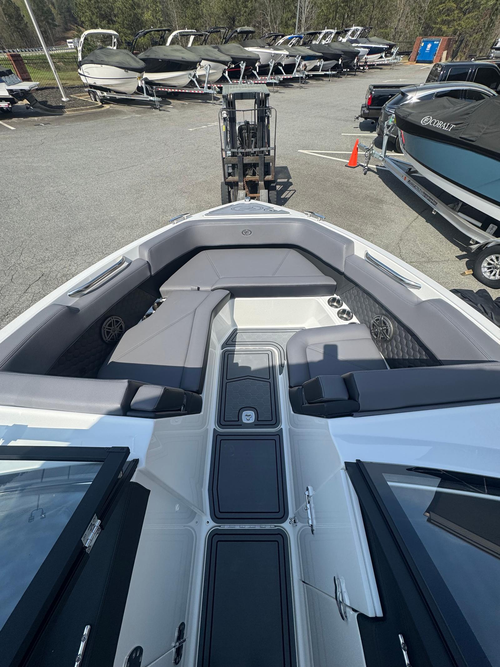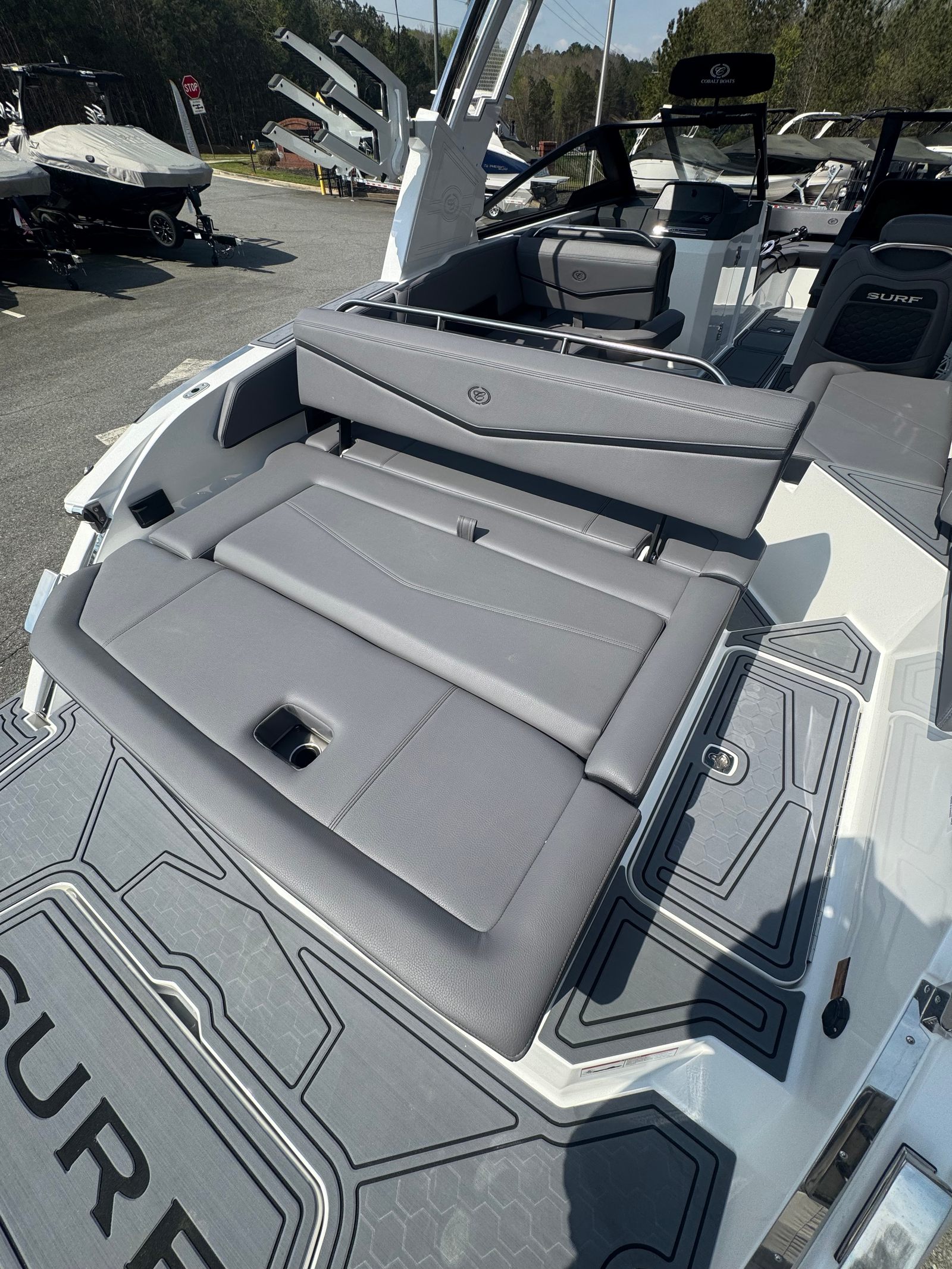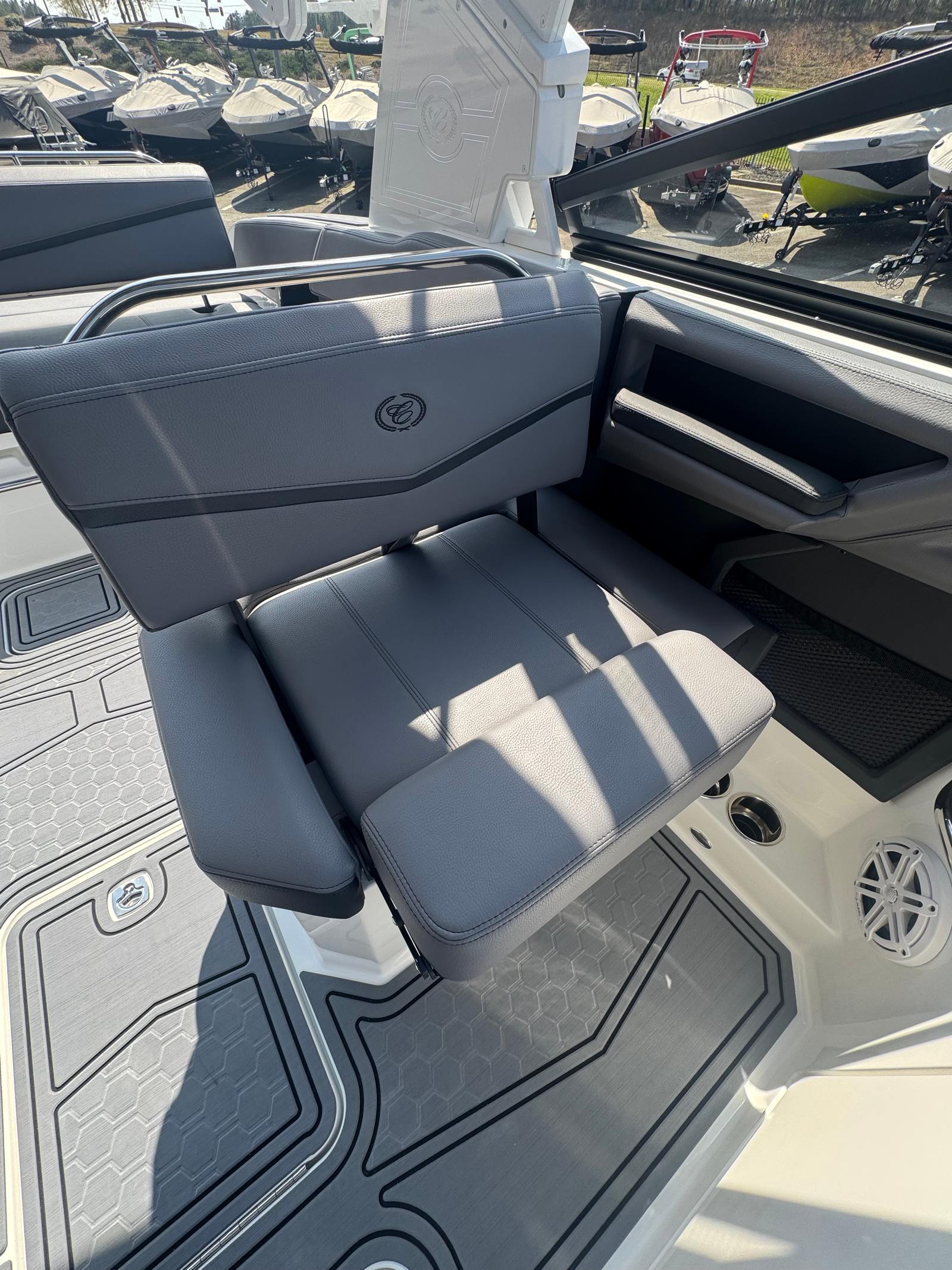 The Cobalt R6 Surf is loaded with premium features that elevate your boating experience. The battery maintainer/charger (110V) ensures your boat is always ready for action, while the rear-facing camera provides enhanced visibility for safer maneuvering and docking. The Cobalt letters in black satin add a touch of sophistication to the boat’s exterior, complemented by stainless steel docking lights that not only enhance safety but also contribute to the boat’s modern aesthetic.The white (folding) El Arch with Prisma and the ebony rotating shade offer both style and functionality, providing shade and comfort for all passengers. The flagpole with flag adds a classic nautical touch, while the glass cockpit with dual Garmin 8610 displays delivers state-of-the-art navigation and control at your fingertips. The head with pump out porta potti ensures convenience during longer outings, and the LED interior accent lighting, featuring customizable R/G/B colors, creates a vibrant and inviting atmosphere for evening cruises.