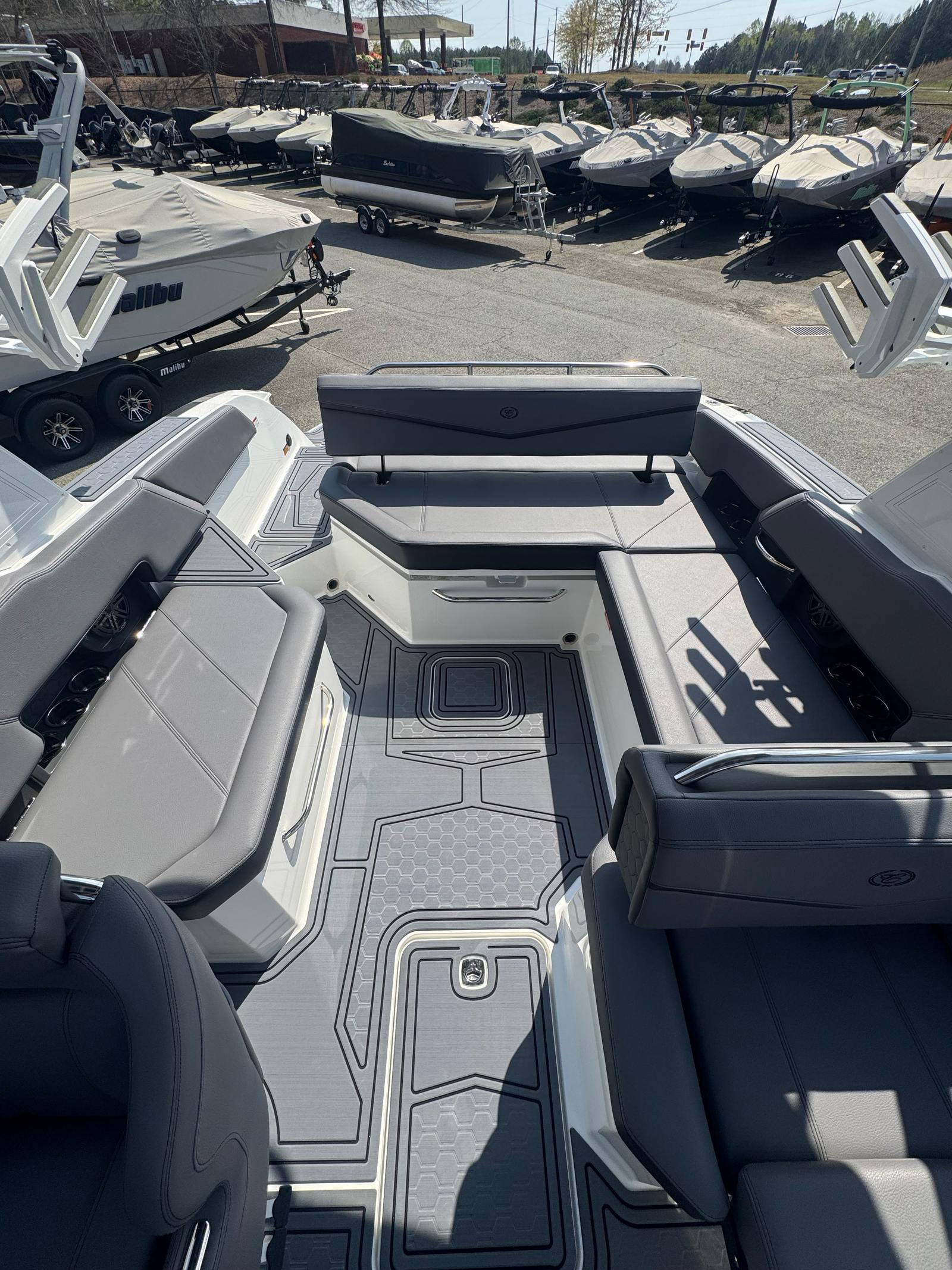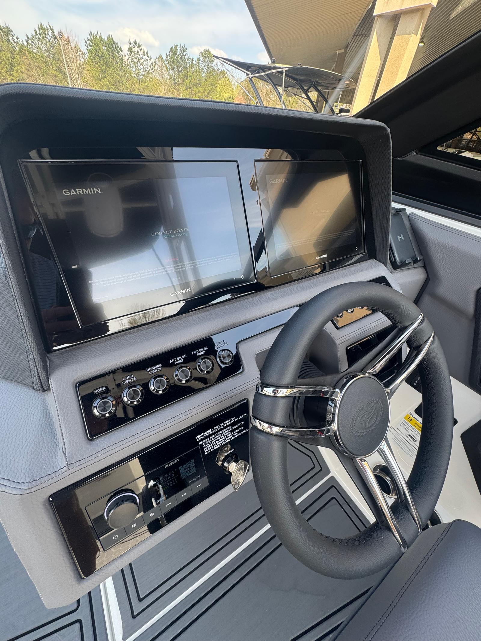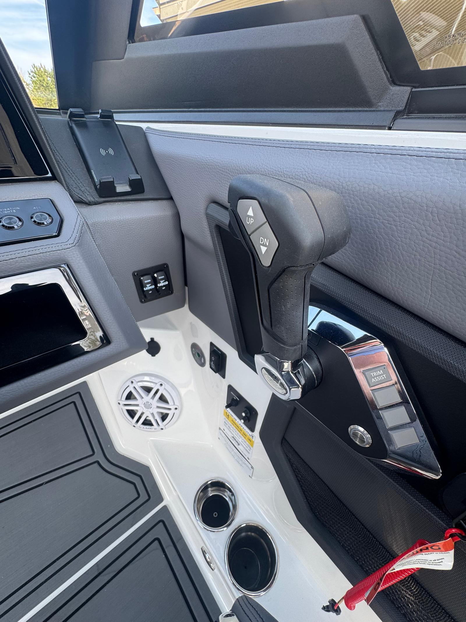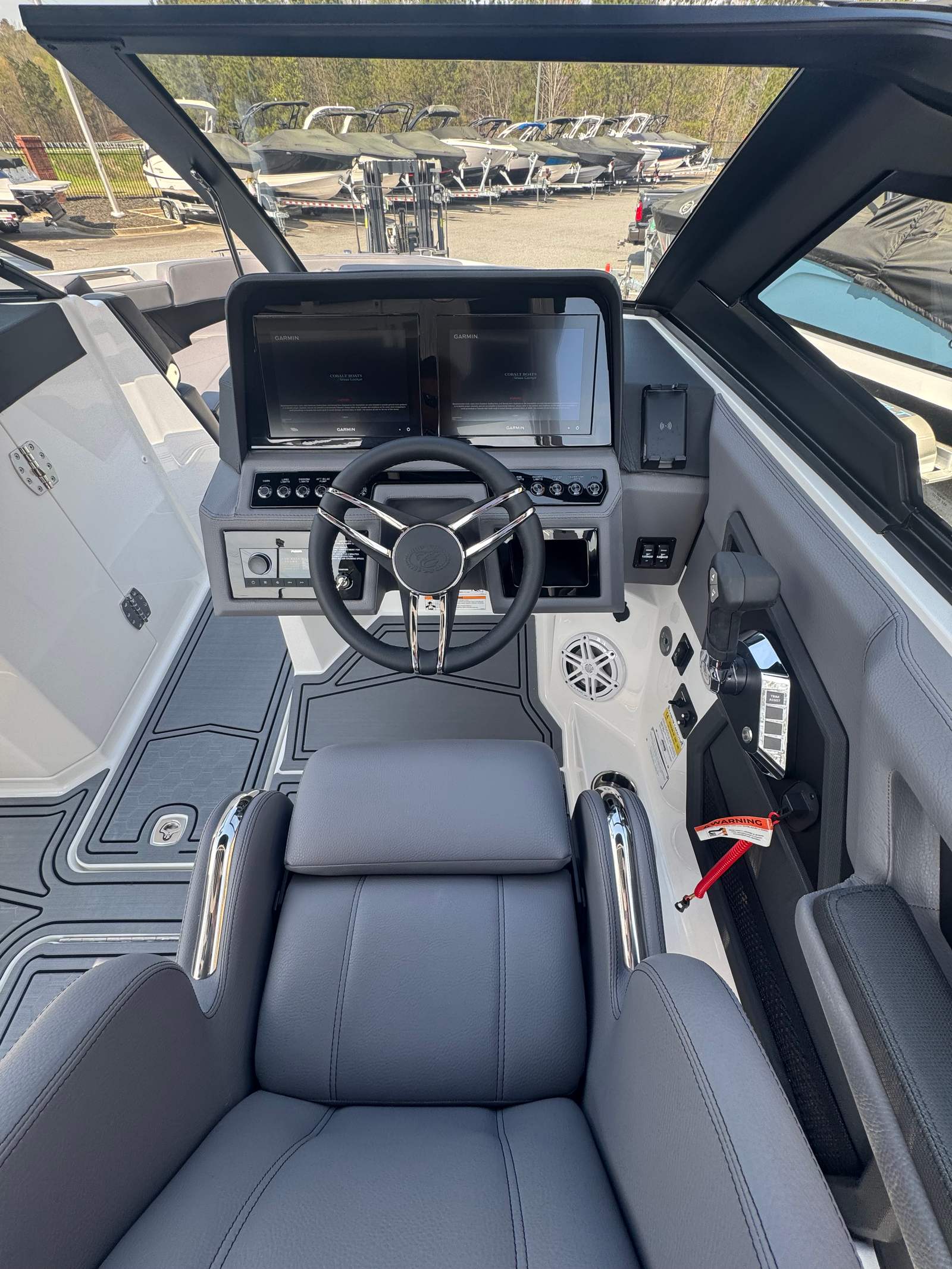 The Cobalt R6 Surf is loaded with premium features that elevate your boating experience. The battery maintainer/charger (110V) ensures your boat is always ready for action, while the rear-facing camera provides enhanced visibility for safer maneuvering and docking. The Cobalt letters in black satin add a touch of sophistication to the boat’s exterior, complemented by stainless steel docking lights that not only enhance safety but also contribute to the boat’s modern aesthetic.The white (folding) El Arch with Prisma and the ebony rotating shade offer both style and functionality, providing shade and comfort for all passengers. The flagpole with flag adds a classic nautical touch, while the glass cockpit with dual Garmin 8610 displays delivers state-of-the-art navigation and control at your fingertips. The head with pump out porta potti ensures convenience during longer outings, and the LED interior accent lighting, featuring customizable R/G/B colors, creates a vibrant and inviting atmosphere for evening cruises.