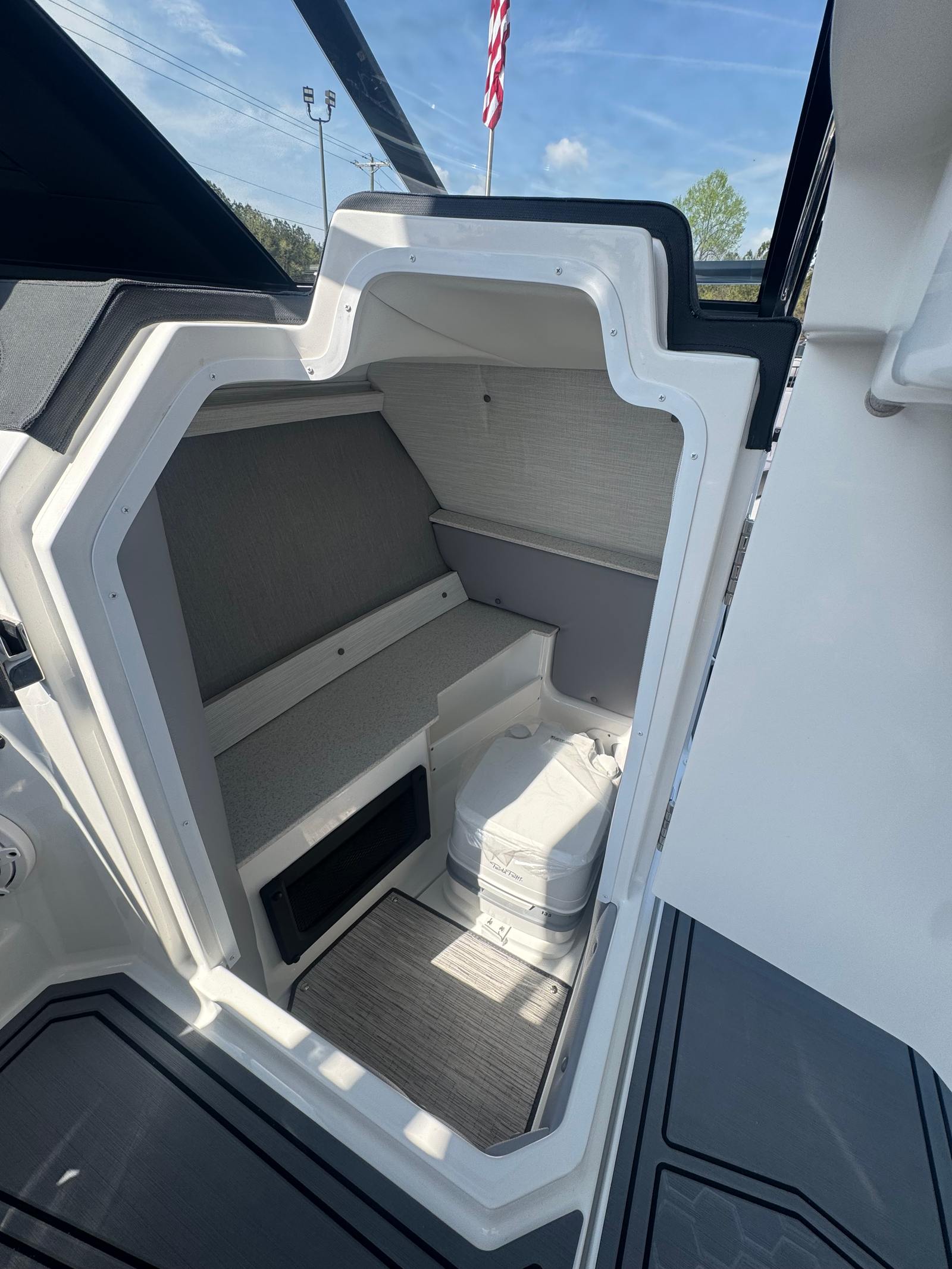 The Cobalt R6 Surf is designed with practicality in mind, making ownership as enjoyable as it is effortless. The rear-facing camera simplifies docking and tight maneuvers, giving you peace of mind in busy marinas. The battery maintainer/charger keeps your systems powered and ready, reducing maintenance hassles. Stainless steel docking lights improve visibility during low-light conditions, while the folding El Arch and rotating shade offer flexible options for sun protection and storage. The head with pump out porta potti adds convenience for longer trips, ensuring comfort for all aboard.