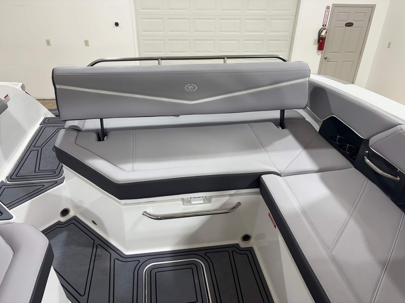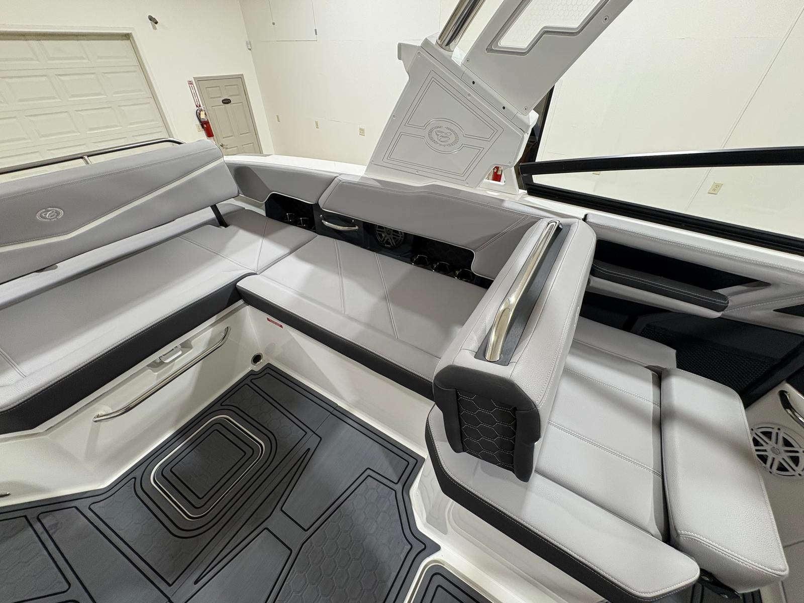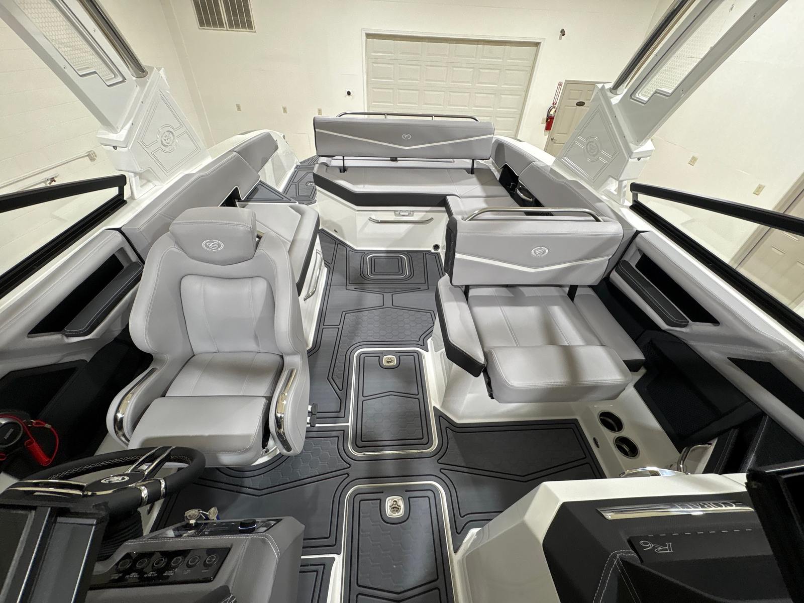 The Cobalt R6 Surf is loaded with premium features that elevate your boating experience. The stainless steel docking lights not only add a touch of elegance but also improve visibility during evening arrivals and departures. The electric arch, Prisma - White (folding) with Navy Bimini, provides shade and protection from the sun while maintaining a sleek profile. The glass cockpit, featuring dual Volvo 8610 displays, offers intuitive control and navigation, ensuring you stay informed and in command at all times.Inside, the Frost, Slate, and White interior creates a comfortable and stylish environment for passengers. LED interior accent lighting with R/G/B options allows you to set the mood for any occasion, while the mooring cover with Prisma folding arch protects your investment when the boat is not in use. The premium sound system, complete with transom speakers and remote, delivers crystal-clear audio throughout the vessel, perfect for entertaining guests or enjoying your favorite tunes while cruising. The Sof-Trac mat in the cockpit and bow, finished in Gray/Ebony, provides a soft, non-slip surface for added comfort and safety.