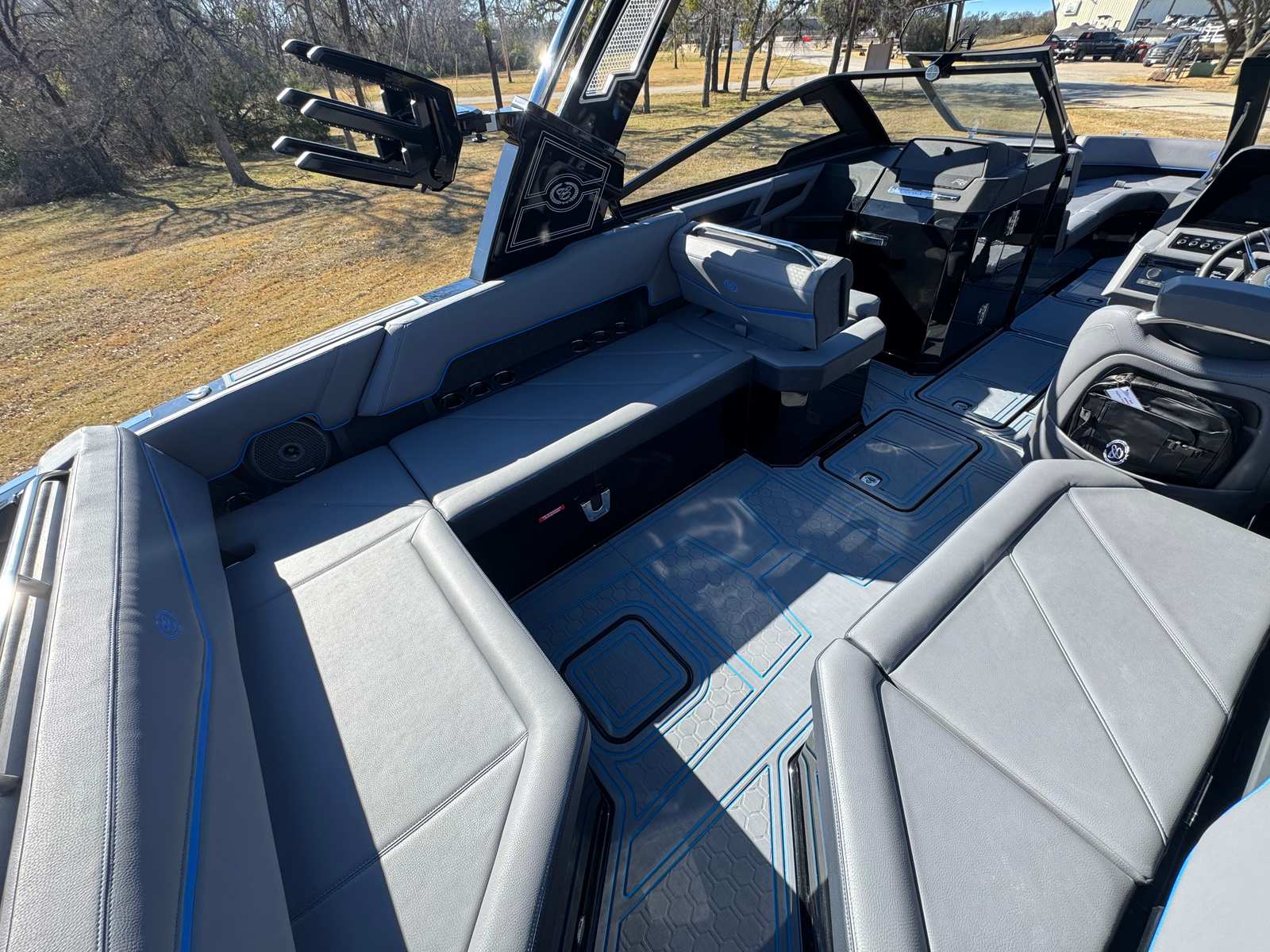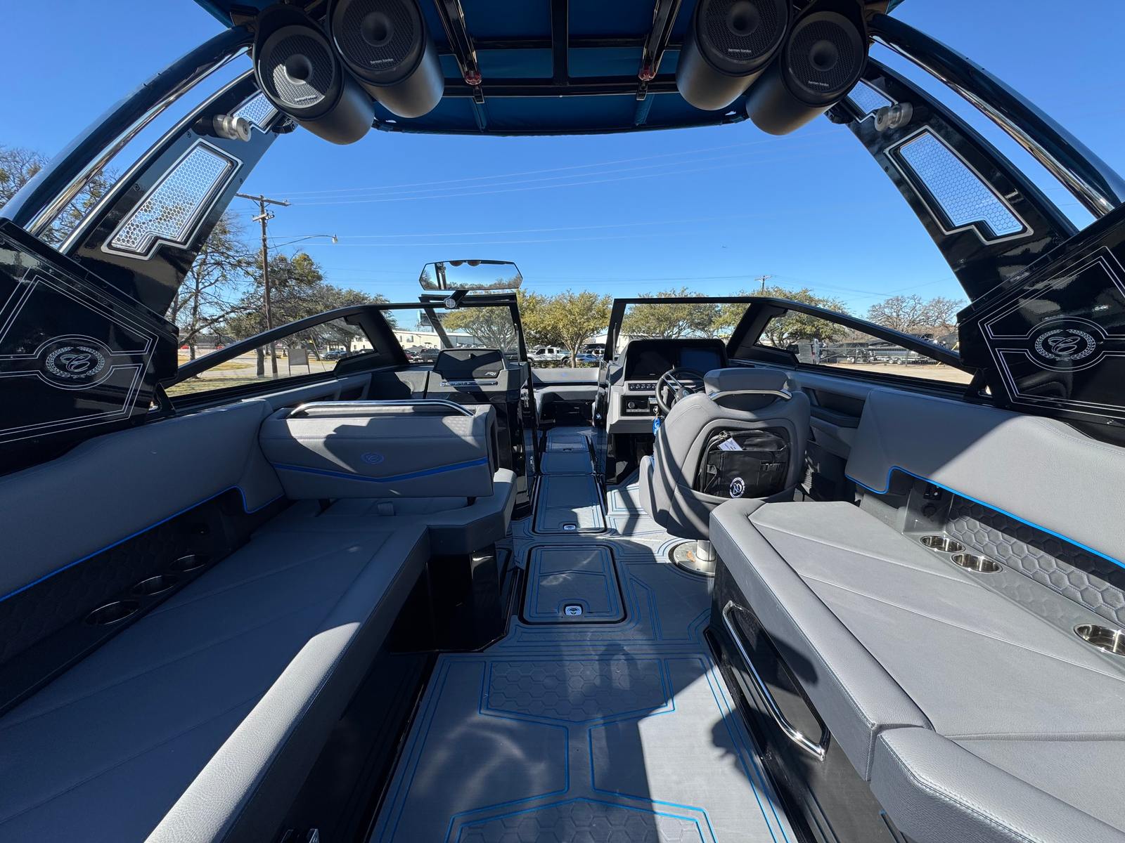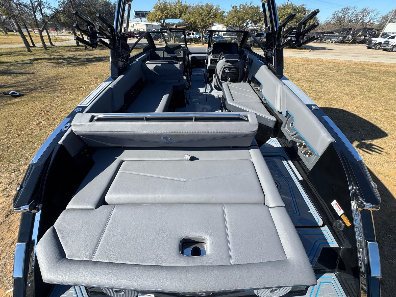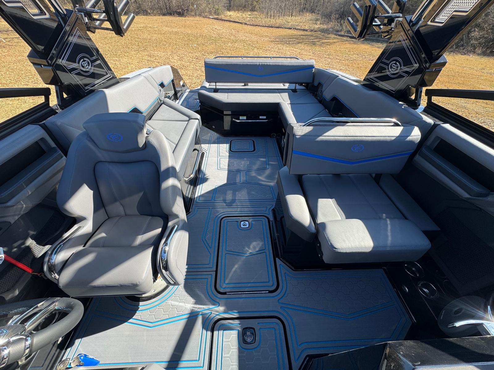 The 2026 Cobalt R8 Surf is packed with premium features that enhance every aspect of your time on the water. Enjoy the shade and comfort provided by the Aft Shade Sail in sleek black, perfect for sunny days and relaxing afternoons. The Air Compressor with Holder adds convenience for inflating water toys or equipment, while the Battery Maintainer/Charger (110V) keeps your boat’s electrical systems in top condition.Bow Filler Cushions offer additional seating and lounging space, ensuring everyone aboard has a comfortable spot to unwind. The Rear-Facing Camera provides added safety and ease when maneuvering or docking, giving you confidence in tight spaces. Distinctive Cobalt Letters in Black Satin add a touch of elegance and brand prestige.The Dinette Table, crafted from solid teak with a cockpit receptacle, creates a welcoming space for meals, snacks, or socializing. Stainless steel Docking Lights illuminate your path during evening outings, enhancing safety and style. The El Arch, Prisma, Black (Fold) Rotatshade in Pacific Blue, combines striking aesthetics with functional shade, while the Electric Adjustable Seat ensures personalized comfort for the captain.