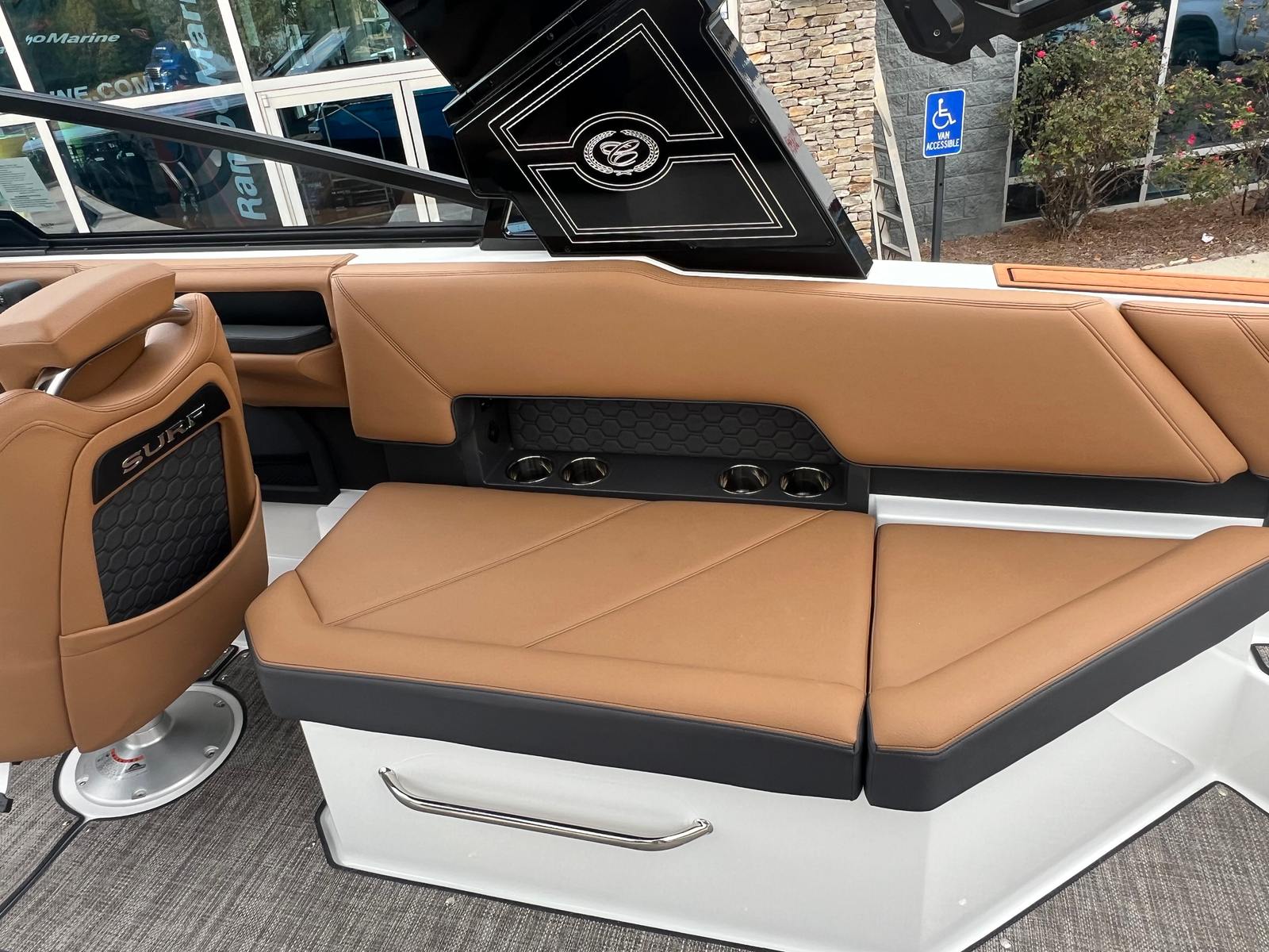 The Cobalt R8 Surf is engineered for convenience and ease of ownership. The folding EL Arch and Ebony Bimini provide flexible shade options and simplify storage, while the stainless steel docking lights make docking and nighttime navigation hassle-free. The battery maintainer/charger ensures your boat is always ready to go, reducing downtime and maintenance worries. The pump out porta potti adds comfort for extended trips, making it easy to spend the whole day on the water. The durable Seagrass and Raw Umber flooring is easy to clean and maintain, so you can focus on enjoying your time rather than worrying about upkeep. With its generous length and smart layout, the R8 Surf offers plenty of storage for gear, refreshments, and personal items, keeping your deck organized and clutter-free.