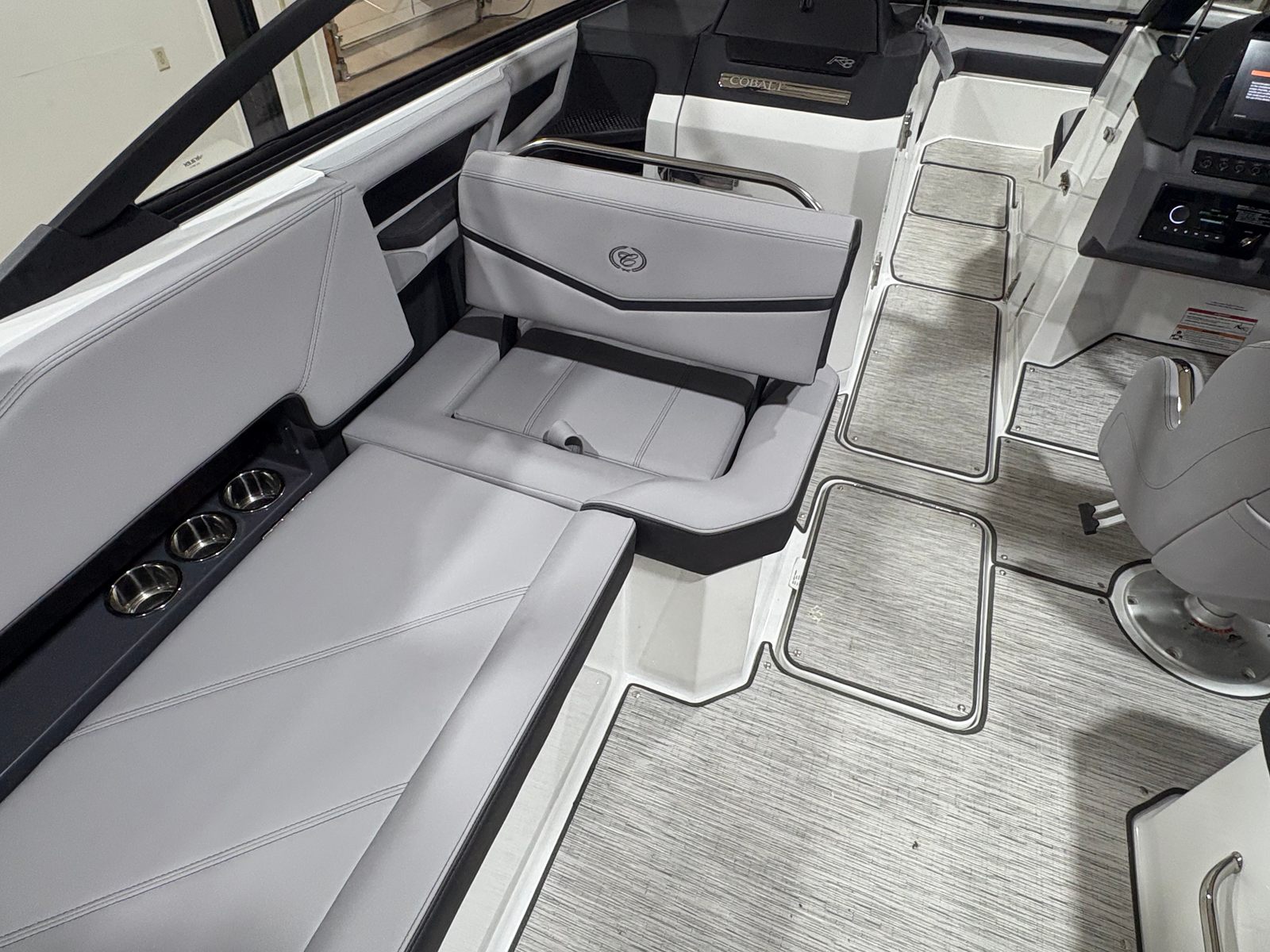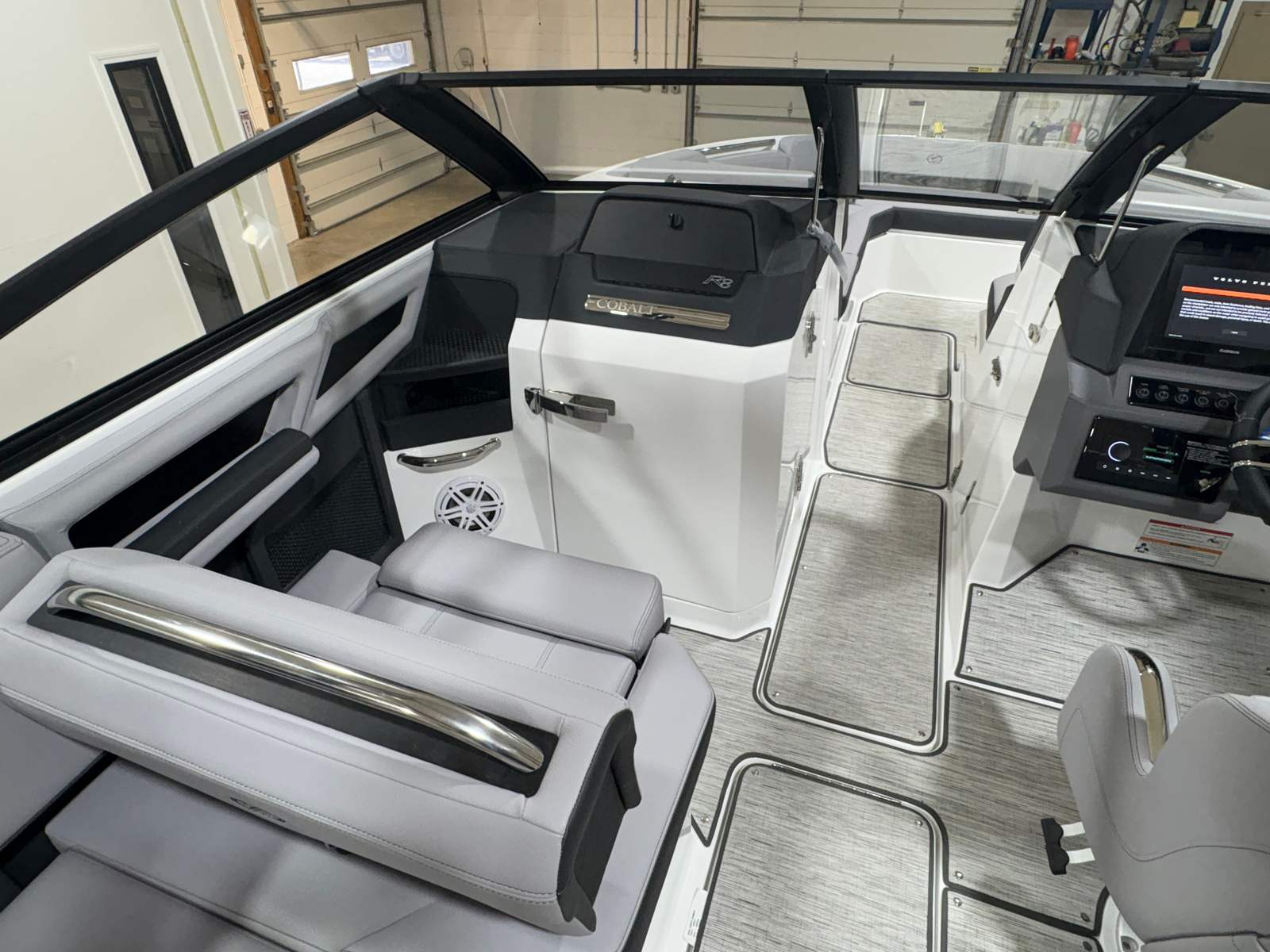 The 2026 Cobalt R8 Surf is packed with premium features designed to enhance every aspect of your boating experience. The exterior boasts Cobalt Letters in Black Satin, giving the boat a sophisticated and modern look. Stainless steel docking lights not only add to the boat’s sleek appearance but also provide enhanced visibility during evening arrivals and departures.Step aboard and you’ll immediately notice the luxurious floor covering in Seagrass, Silver Ash, which offers both comfort and durability. The interior is finished in a striking combination of Frost, Slate, and Ebony, creating an inviting and stylish atmosphere for you and your guests. The glass cockpit, featuring dual Volvo 8610 displays, puts advanced navigation and control at your fingertips, ensuring a seamless and intuitive boating experience.The hull bottom in Frost Gray complements the boat’s overall aesthetic, while LED interior accent lighting with customizable R/G/B colors sets the perfect mood for any occasion. A mooring cover helps protect your investment when the boat is not in use, and the E2 folding arch adds both functionality and flair. For those who love music on the water, the premium sound system with transom speakers and remote ensures your favorite tunes are always within reach, whether you’re anchored or underway.