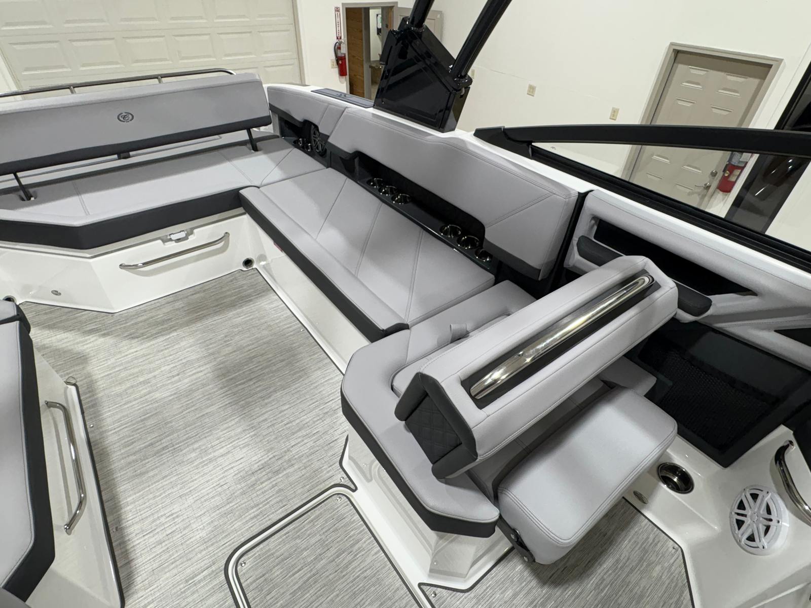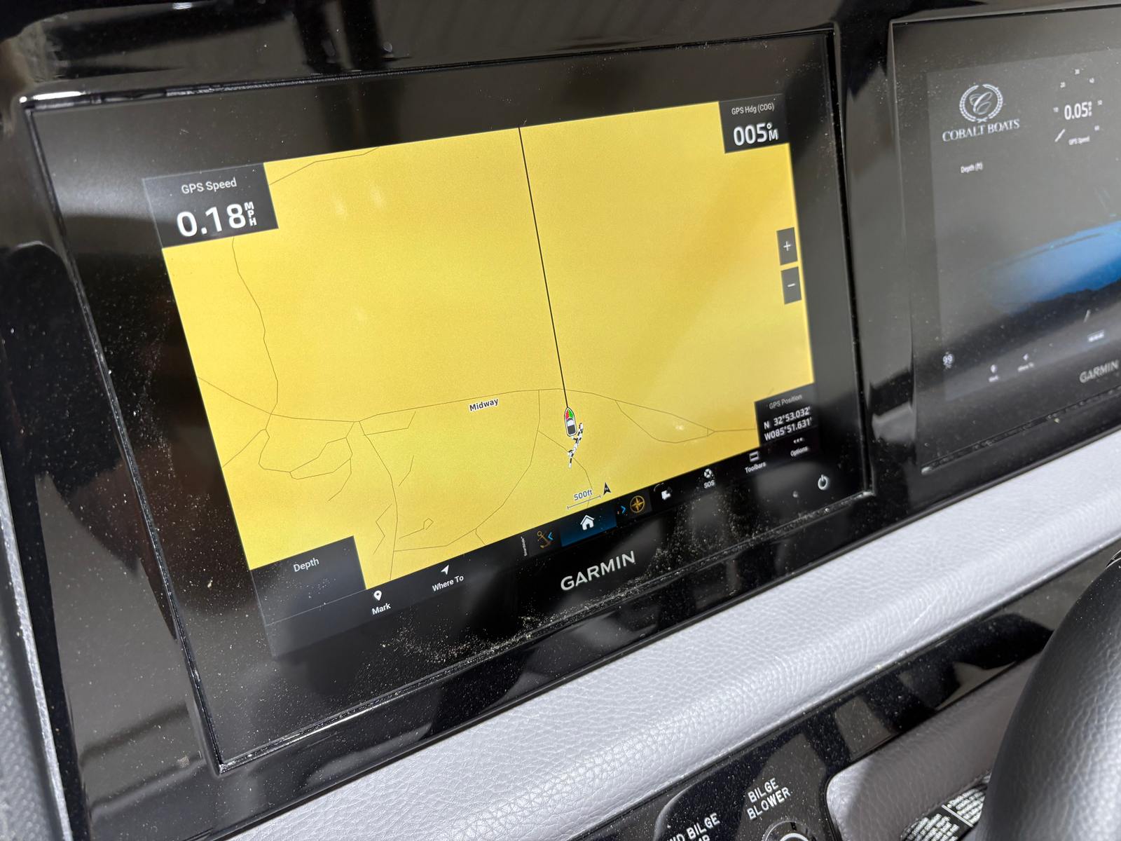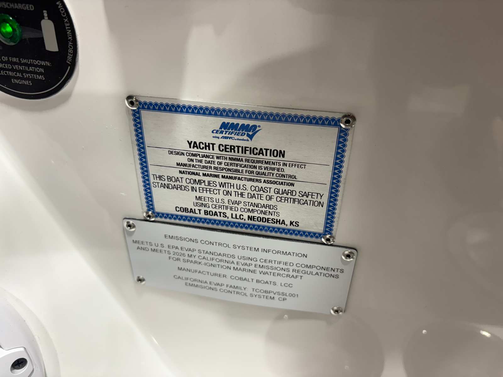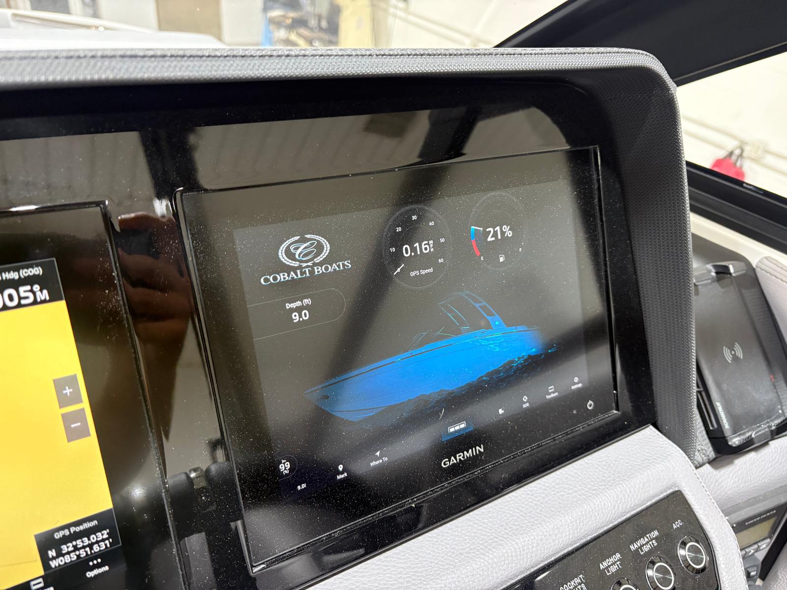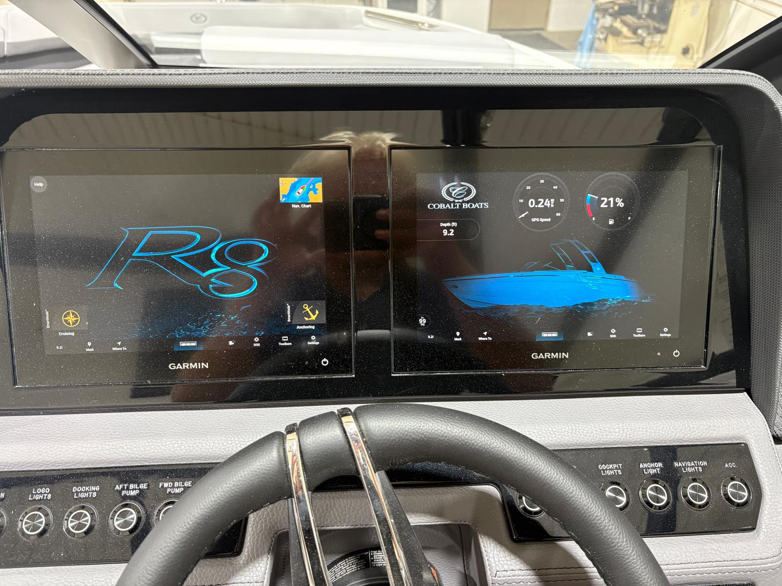 The 2026 Cobalt R8 is loaded with special features that elevate both its aesthetic appeal and functionality. The Accent Stripe in Light Sage adds a subtle touch of elegance, while the Black (Folding) Arch, E2 with Ebony Bimini, provides shade and style for sunny days on the water. The Cobalt Letters in Black Satin offer a refined branding detail that complements the boat’s overall look.For enhanced visibility and safety during evening cruises or docking, the stainless steel docking lights are a standout feature. The floor covering in Seagrass, Silver Ash, not only looks stunning but also provides a comfortable, non-slip surface underfoot. The interior, finished in Frost and Slate, creates a cool, inviting atmosphere that’s perfect for relaxing or socializing.The glass cockpit is equipped with dual Garmin 8610 displays, offering state-of-the-art navigation and control at your fingertips. This advanced technology ensures you’re always in command, whether you’re charting a course or monitoring performance metrics. Every detail, from the hull bottom in Rich Ebony to the Frost Gray hull sides, reflects Cobalt’s commitment to quality and craftsmanship.
