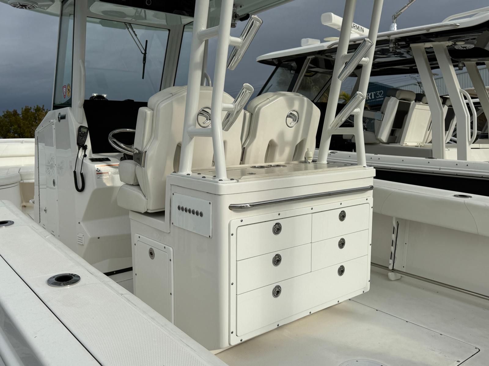 Powering the Edgewater 325 CC are twin engines, delivering a combined 600 horsepower. This impressive setup ensures that the boat offers exhilarating speed, responsive handling, and reliable performance whether you are cruising along the coast or heading offshore for a day of fishing. The dual-engine configuration not only enhances power but also provides added safety and maneuverability, making docking and navigating tight spaces a breeze. With only 80 hours on the engines, you can be confident in the longevity and reliability of this Center Console boat for sale.