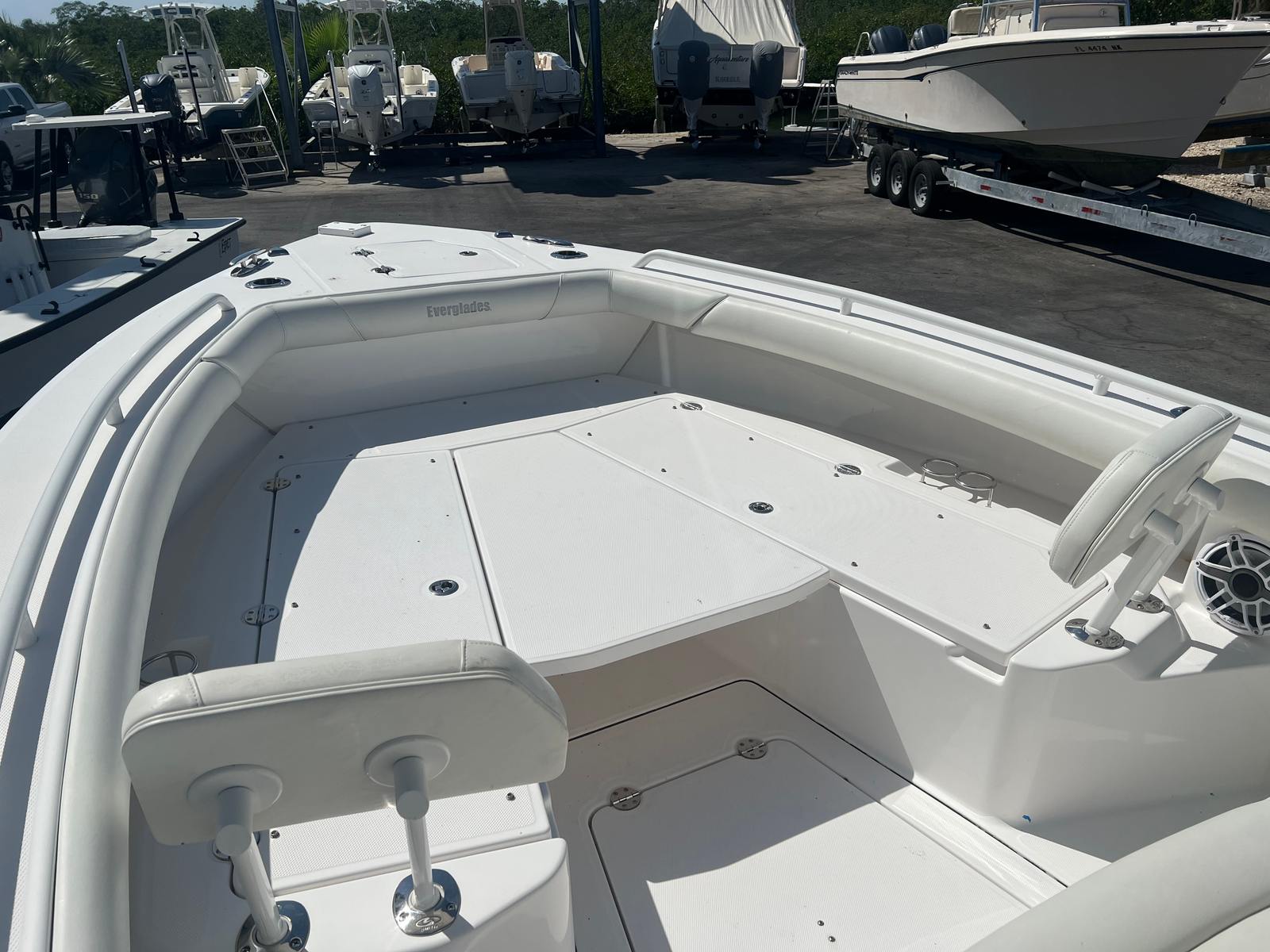 Just Listed! 2021 Everglades 273 CC powered with Twin Yamaha F250s with 230 hours. This boat is equipped with Optimus Joystick, Dual 16" Garmin screens, Garmin Autopilot, Garmin VHF Radio, Fusion Sound System, a Minn Kota Trolling motor, and a 10' Powerpole. The Everglades 273 CC is the ultimate hybrid center console. With an 18" draft you can run creeks and Bays with confidence while also maintaining the legendary Everglades ride for the days you want to charge offshore. The boat is on the lot at Caribee Boat Sales and Marina in Islamorada. Give us a call to schedule a showing.