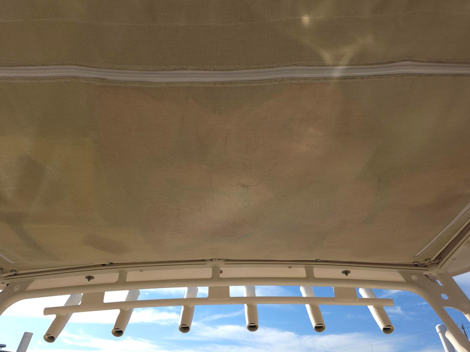 Custom aft shade with fitting in hard top rod holders