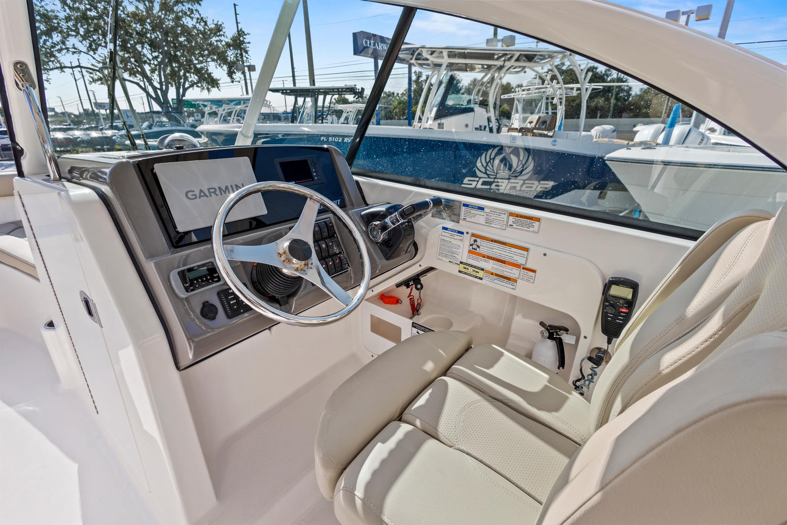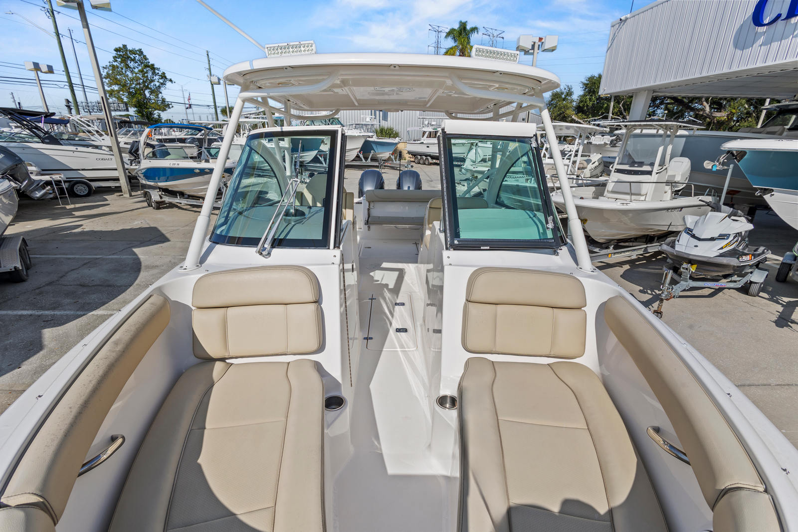 The Yamaha digital gauges, electronic throttle and shift (DES), and integrated hydraulic steering provide a responsive and intuitive helm experience. Whether docking in tight quarters or running in choppy conditions, this setup offers the precision and control you expect from a premium dual-console vessel.