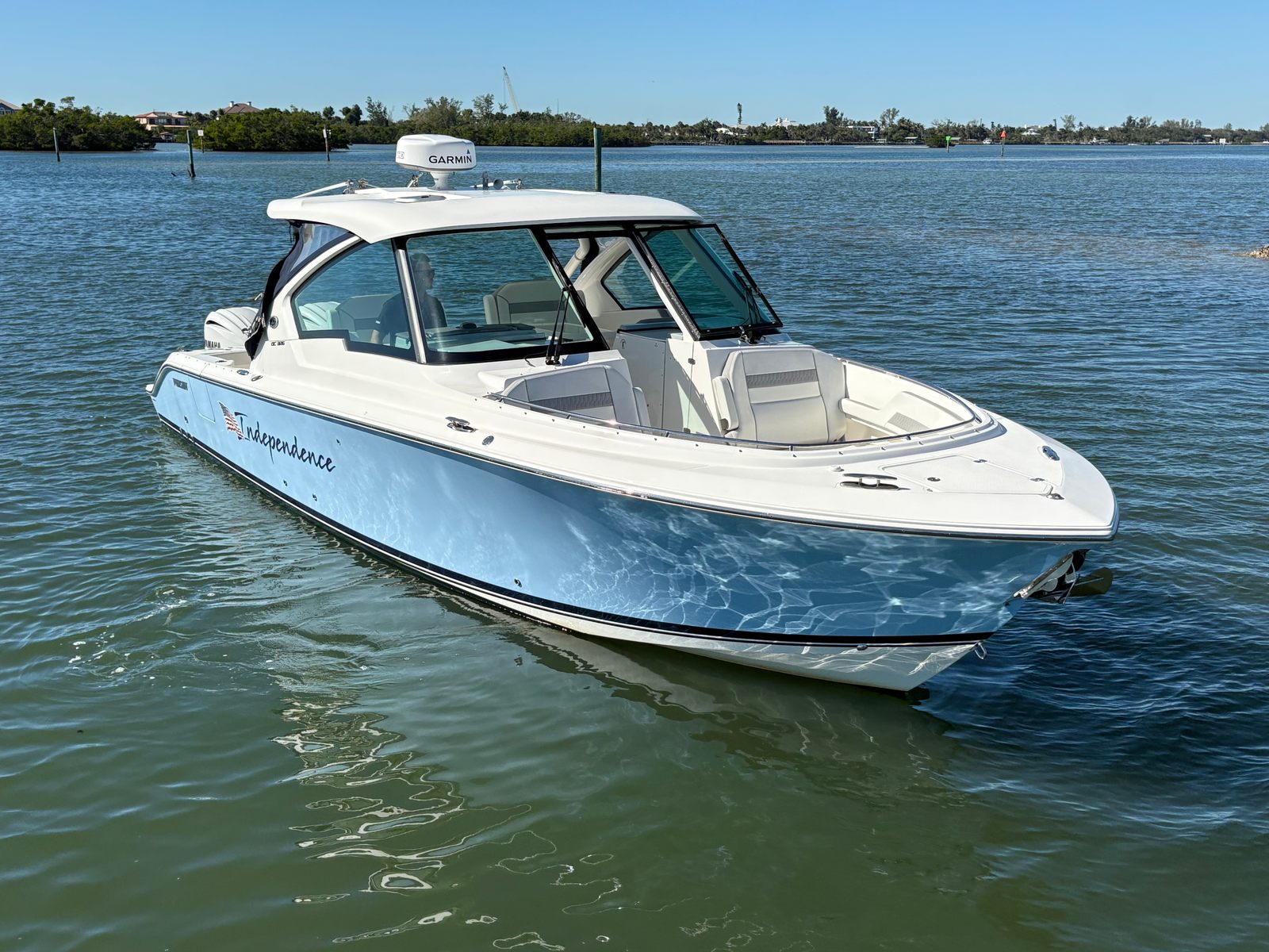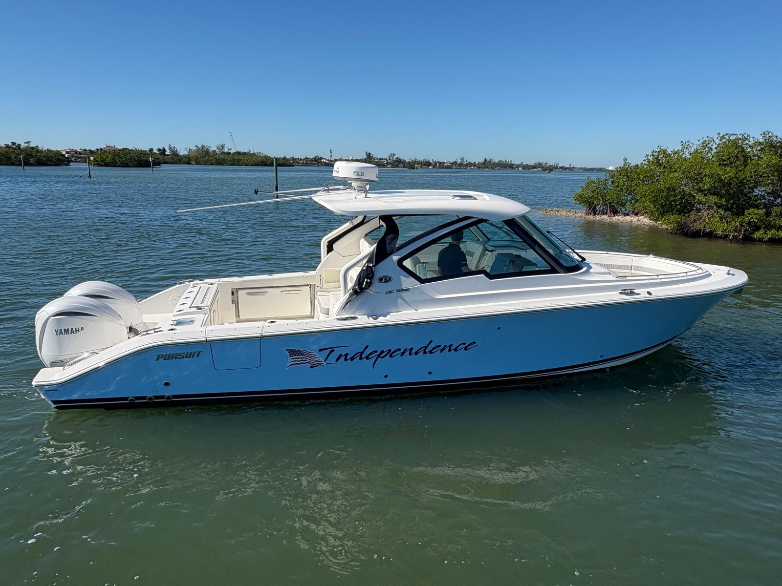 Step aboard to find crisp white upholstery, a bridge deck table, and a custom retractable sunshade for flexible entertaining. Enjoy immersive sound with the Premium JL Audio Package, and protect your investment with an aft curtain, instrument cover, and bow tonneau cover. Equipped with Garmin GMR 24 xHD radar, this 326 DC is fully outfitted for cruising, fishing, or relaxing days on the water. Well-maintained, beautifully optioned, and turnkey ready. Note this boat is bottom painted.