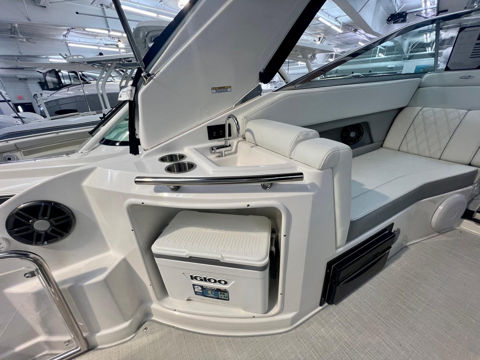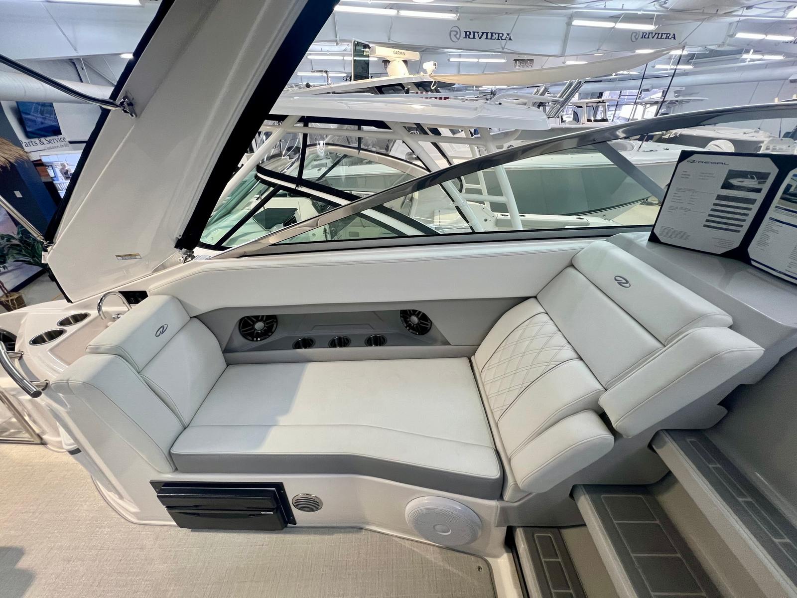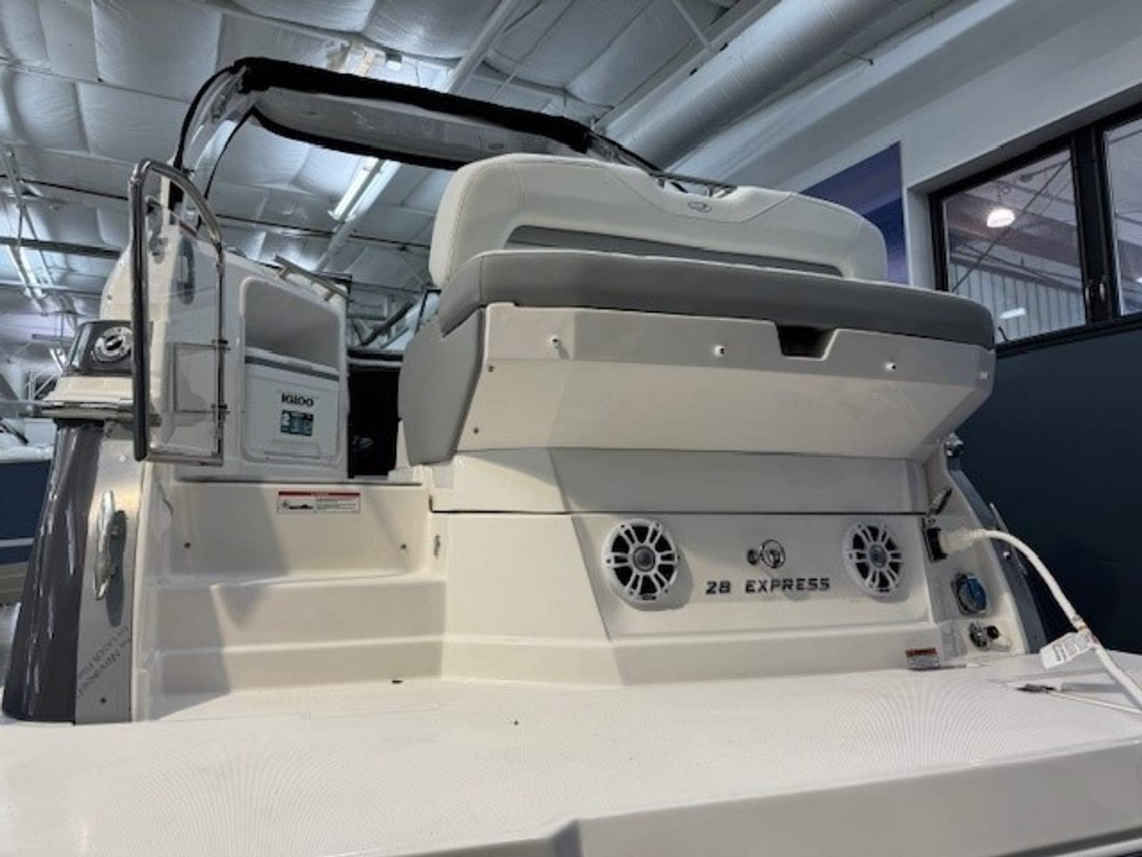 This Regal boat for sale comes loaded with special features designed to enhance your boating experience. The full enclosure, crafted from durable black canvas, provides protection from the elements, allowing you to enjoy your time on the water regardless of the weather. The cockpit is adorned with a luxurious Seagrass mat, offering both comfort and style underfoot, while the Snowcap accents add a touch of elegance to the overall design. The combination of high-quality materials and thoughtful design elements ensures that every moment spent aboard the Regal 28 Express is one of comfort and sophistication.