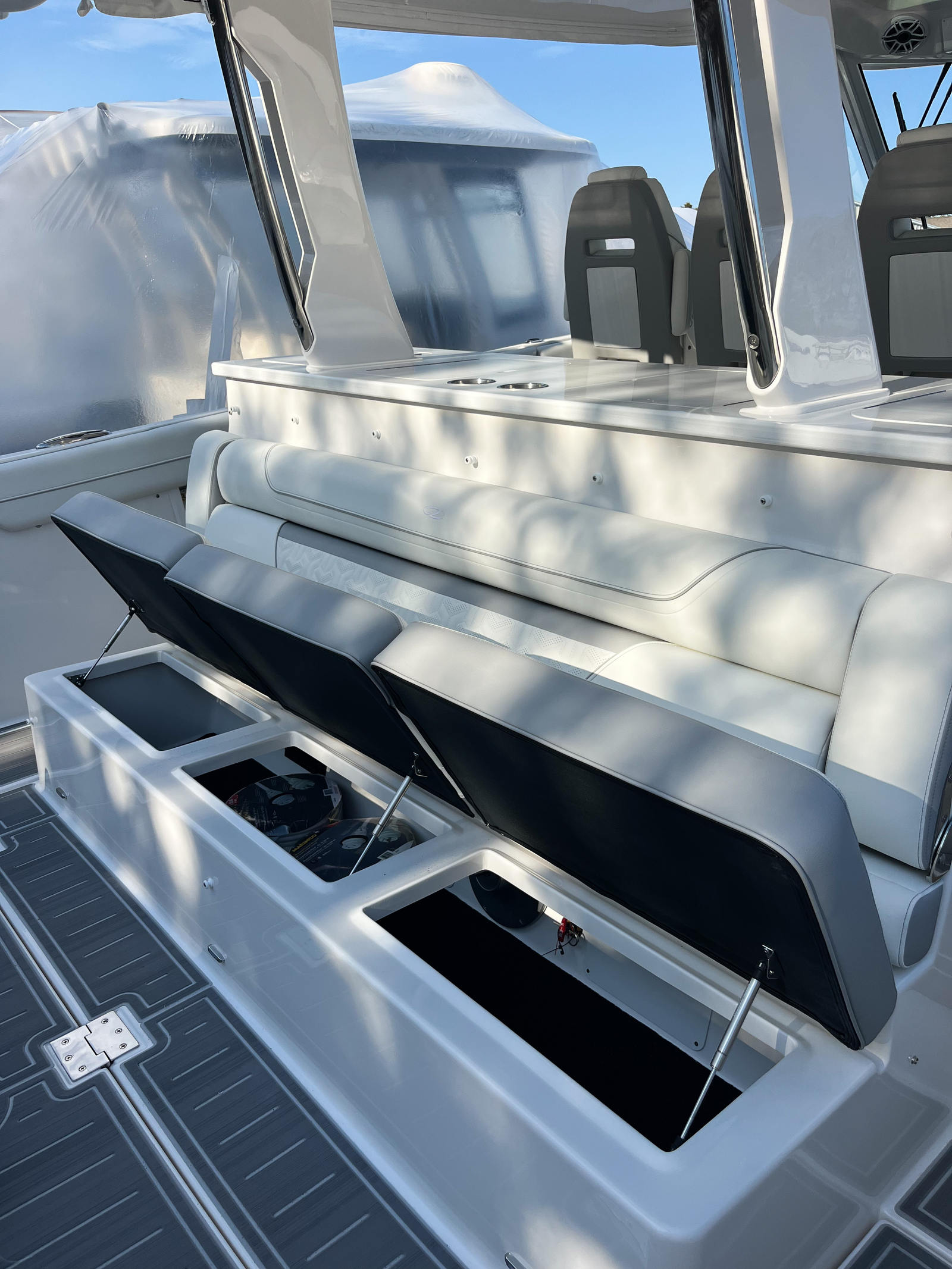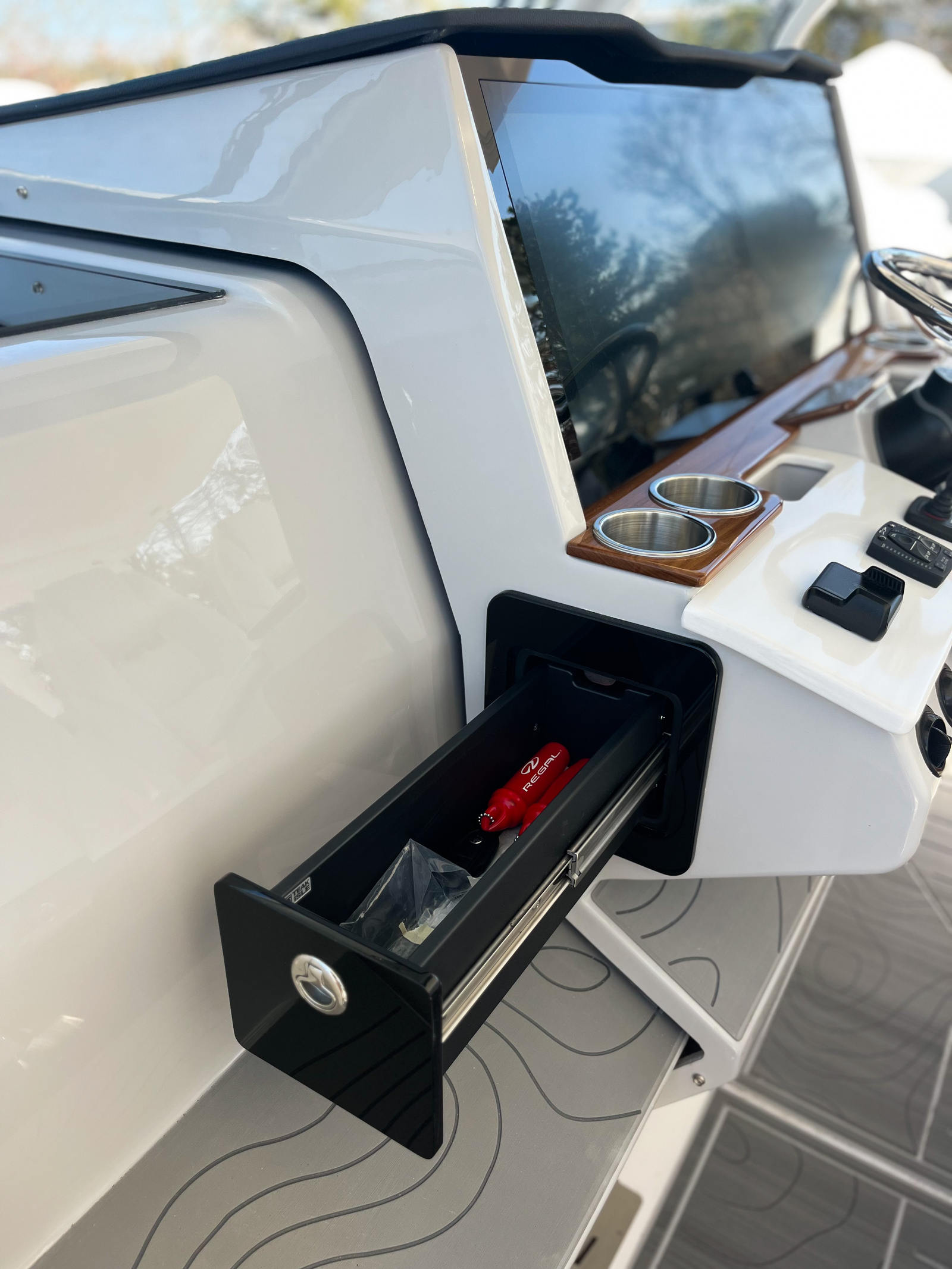 The Regal 38 SAV is as practical as it is luxurious. The anchor windlass with rope and chain simplifies the anchoring process, allowing you to secure your yacht quickly and confidently. Fender clips make docking straightforward, reducing stress and protecting your investment. The cockpit refrigerator is perfect for keeping snacks and beverages cool, ensuring you are always ready for a day of fun on the water.Storage solutions throughout the yacht provide plenty of space for gear, supplies, and personal items, keeping the deck clutter-free and organized. The efficient engine system not only delivers impressive power but also helps manage fuel consumption, making it easier to plan longer trips without frequent stops. The gray water system adds another layer of convenience, allowing you to enjoy extended stays on the water with minimal impact on the environment.