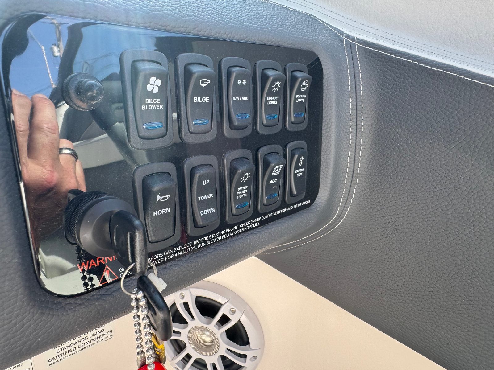 The Regal LS2 Surf comes equipped with a range of special features that elevate your boating experience. The Volvo V8 300 FWD EVC2 DP CAT engine is a standout, offering advanced technology for superior performance. The hull’s Black color, complemented by the Flame Red bootstripe and Graphite bottom, creates a bold and dynamic look on the water. Titanium details add a modern touch, while the Travel Storage Cover in Black and matching Canvas provide protection and style when the boat is not in use. Inside the cockpit, the Seagrass Mat offers comfort and durability, making it easy to relax or entertain guests. The SeaDek Swim Platform provides a safe and comfortable area for swimming, lounging, or preparing for watersports. The Dual Battery Switch with tray and cables ensures reliable power management, so you can enjoy longer days on the water without worry.