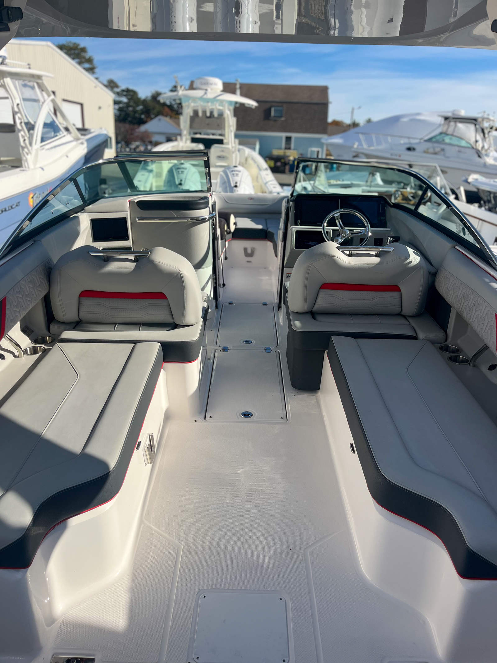 The 2024 Regal LX6 is loaded with premium features that enhance every aspect of your time on the water. The Stereo Performance & Lighting Package transforms the cockpit into an entertainment hub, delivering crisp, immersive sound and vibrant lighting effects for unforgettable onboard parties. Bow & Cockpit Covers provide essential protection from the elements, keeping your boat looking pristine and ready for adventure.For those who love water sports, the Water Sport Tow Pylon is a game-changer, making it easy to tow skiers, wakeboarders, or tubers with confidence. The Dual Battery Switch with Tray and Cables ensures reliable power management, so you can enjoy all your electronics and amenities without worry.The LX6’s interior is a showcase of style and comfort, featuring Flame Red - Simtex and Graphite - Standard upholstery for a bold, contemporary look. The Port Light - Half Moon adds a touch of elegance and natural light to the cabin, while the Cockpit Seagrass Mat provides a soft, non-slip surface underfoot. Underwater Lighting - RGBW creates a mesmerizing ambiance for evening cruises, and the Lunar Grey - Standard accents complete the sophisticated aesthetic.