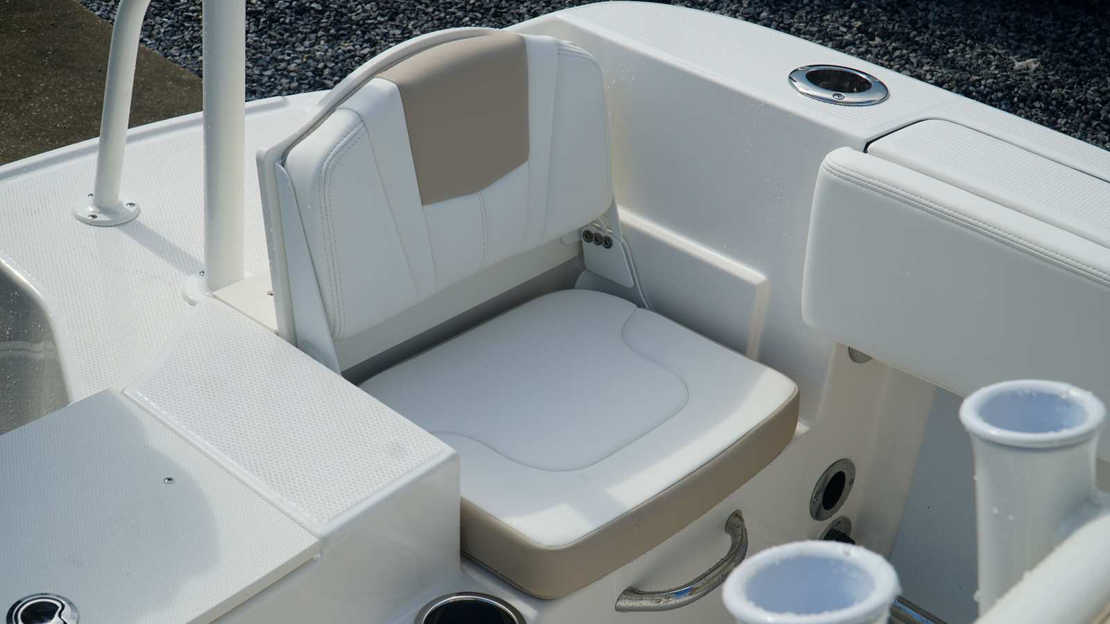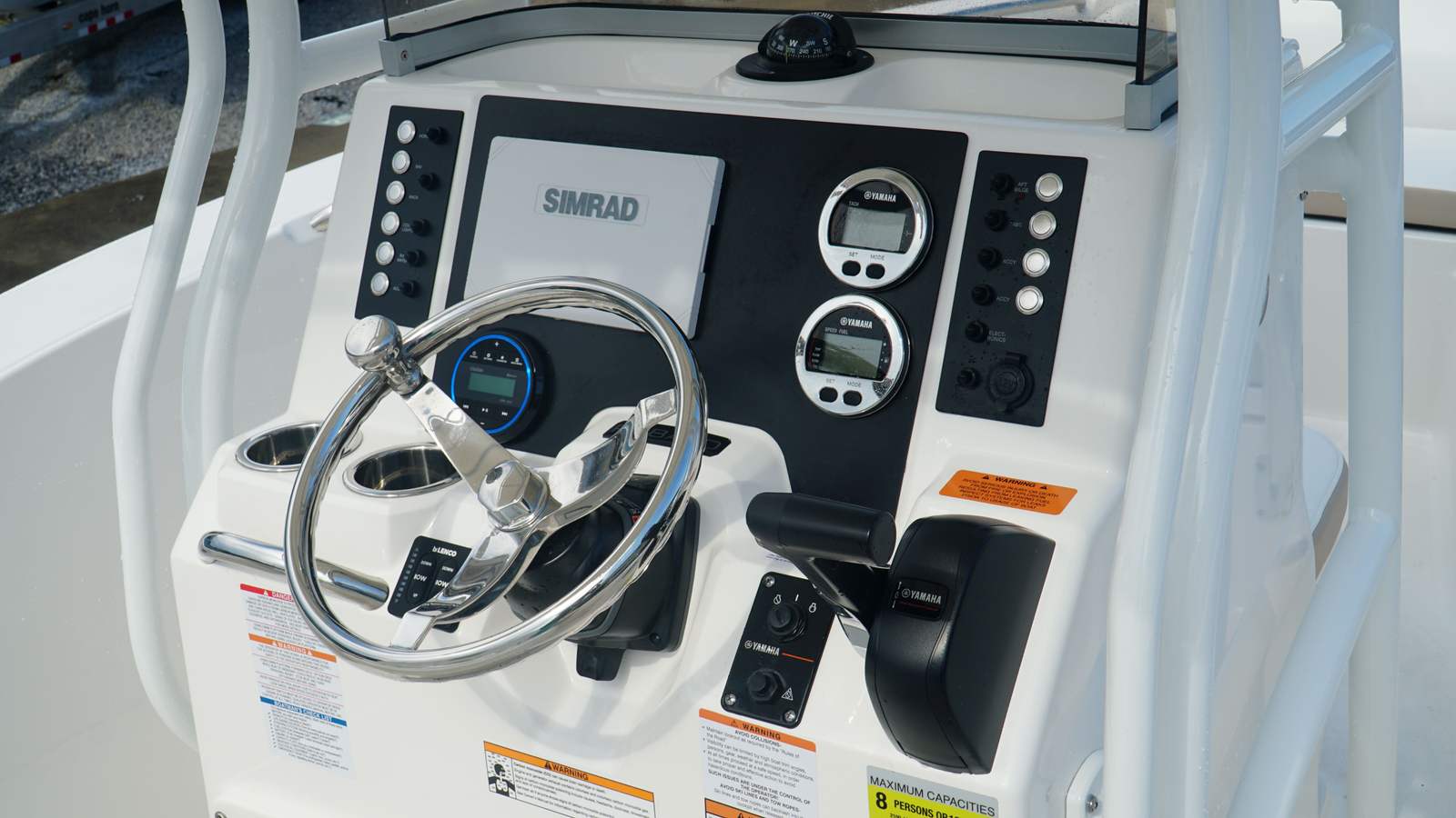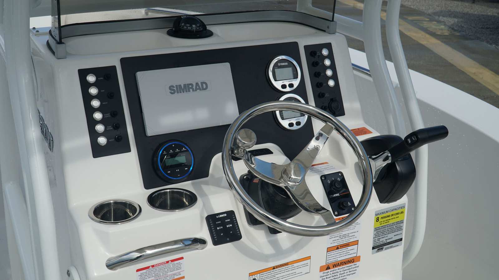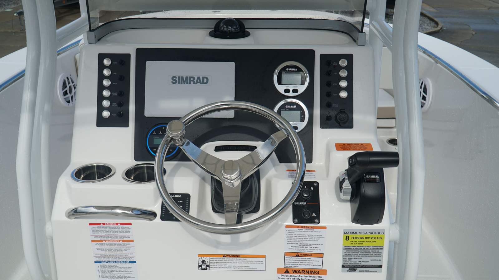 The Robalo 200 CC is loaded with features designed to enhance your boating experience. The Ice Blue hull side gelcoat not only adds a touch of elegance but also provides long-lasting protection against the elements. The cockpit interior, finished in a sophisticated Sand color, offers both comfort and style, creating a welcoming environment for you and your guests. The white canvas color and white powdercoated T-Top provide excellent shade and protection from the sun, allowing you to stay cool and comfortable during long days on the water.Navigation and fish-finding are made effortless with the Simrad NSX9 Touch Multifunction Chartplotter/Fishfinder, a state-of-the-art system that delivers accurate and detailed information at your fingertips. The tilt steering helm ensures ergonomic comfort, allowing you to adjust the wheel to your preferred position for maximum control. The dual battery system provides peace of mind, ensuring you have reliable power for all your electronics and accessories. Trim tabs with indicators allow you to fine-tune your ride, improving stability and fuel efficiency in varying sea conditions.