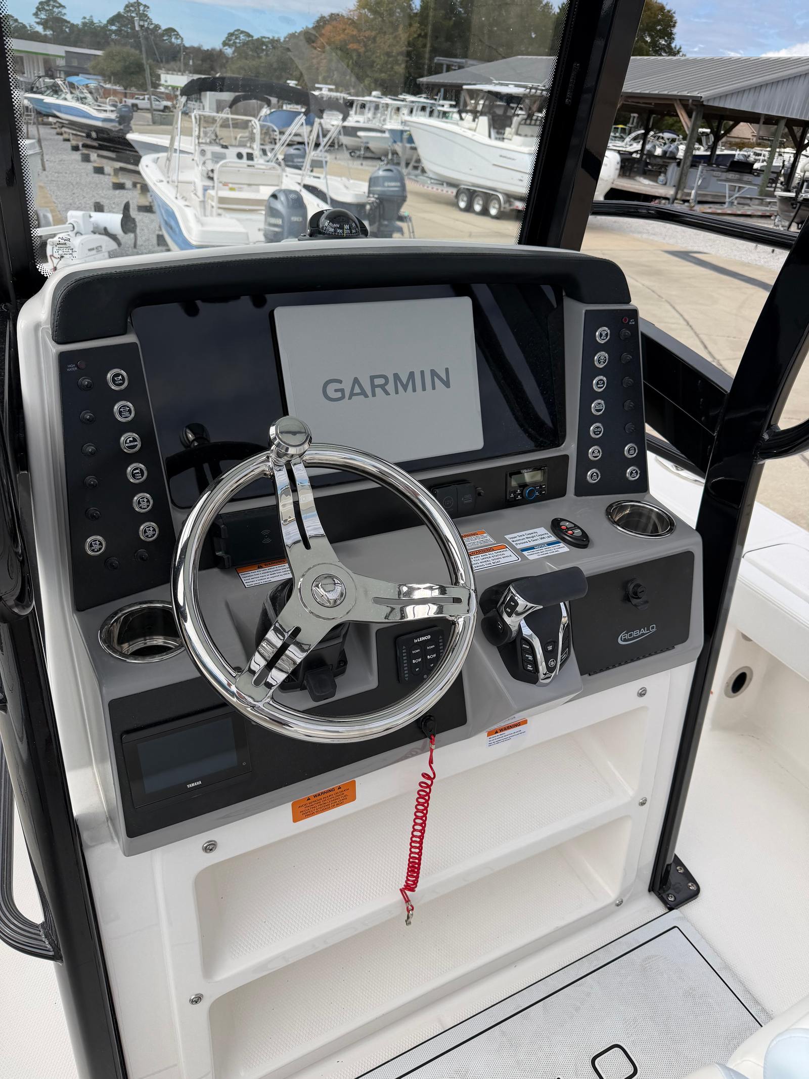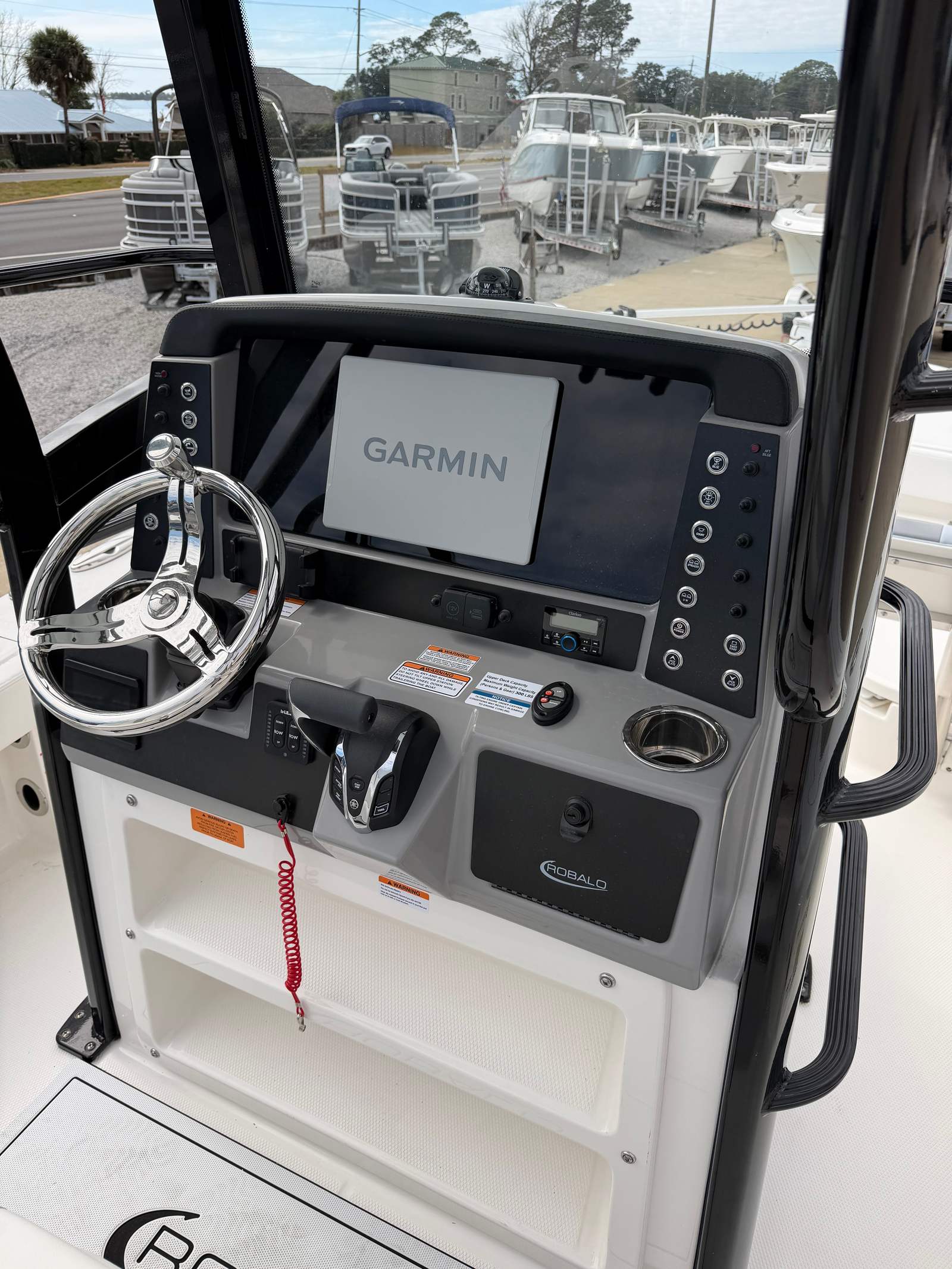 The Robalo 246 Cayman SD is loaded with premium features that set it apart from other bay boats. The hard top, complete with black powder coating, offers superior protection from the elements while adding a bold, modern look. The underside of the hardtop is finished in Ice Blue gel color, complementing the hull and creating a cohesive, eye-catching aesthetic. For added comfort and shade, the forward canvas fly in white canvas provides relief from the sun during long days on the water.Navigation and fish-finding are elevated to new heights with the inclusion of a Garmin GPSMap 1243XSV at the main helm and a Garmin GPSMap 943XSV at the upper station. These advanced systems offer crystal-clear displays, intuitive controls, and comprehensive chart plotting capabilities, ensuring you always know your position and can easily locate the best fishing spots. The transducer B175M upgrade further enhances sonar performance, delivering detailed underwater views for serious anglers.The stainless steel steering wheel, featuring a soft grip and control knob, adds a touch of luxury and ensures comfortable, responsive control at all speeds. Every detail of the Robalo 246 Cayman SD is designed to enhance your experience, from the stylish finishes to the state-of-the-art electronics.