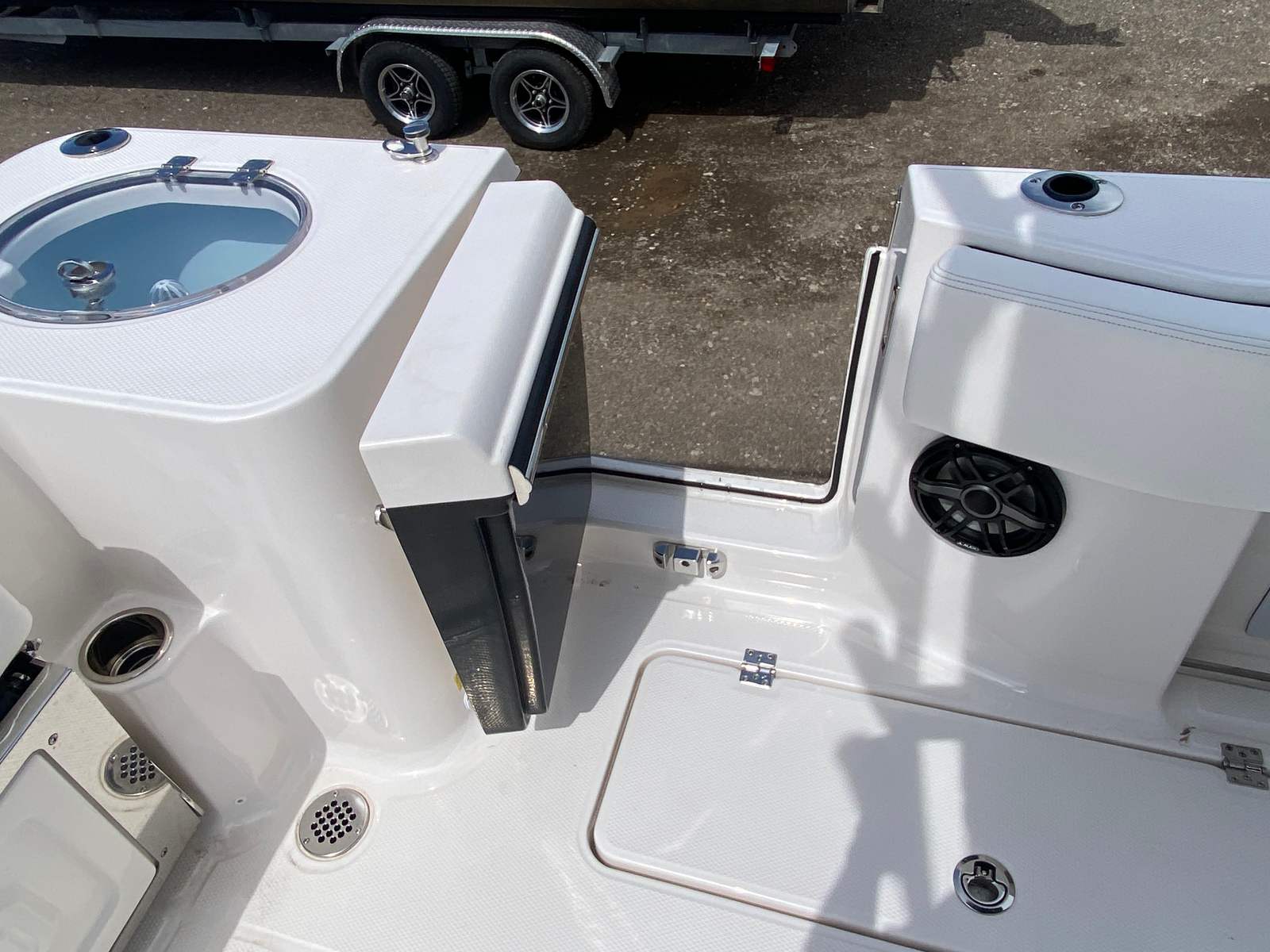 The Robalo 270 CC is as practical as it is fun. Its thoughtful design makes docking and maneuvering a breeze, even in tight spaces. The dual engines provide not only power but also redundancy, offering added peace of mind during longer journeys. The Windlass Package simplifies anchoring, saving you time and effort, while the spare tire kit ensures you’re prepared for the road as well as the water.Storage solutions are integrated throughout the boat, allowing you to keep your gear organized and easily accessible. The stowable boarding ladder and Seadek helm mat enhance comfort and safety, making every outing more enjoyable. The full coverage hardtop provides shade and protection, allowing you to stay comfortable no matter the weather.