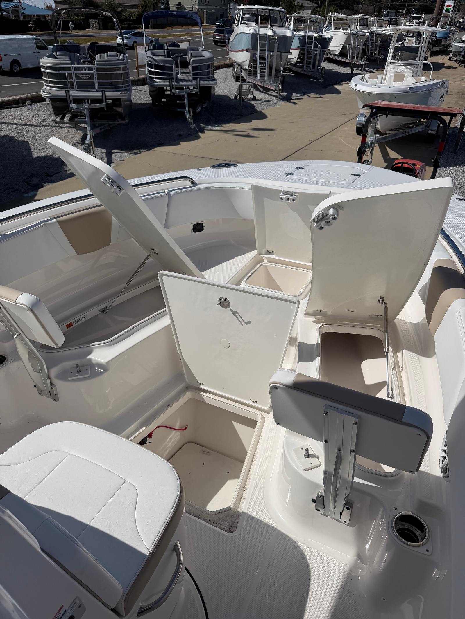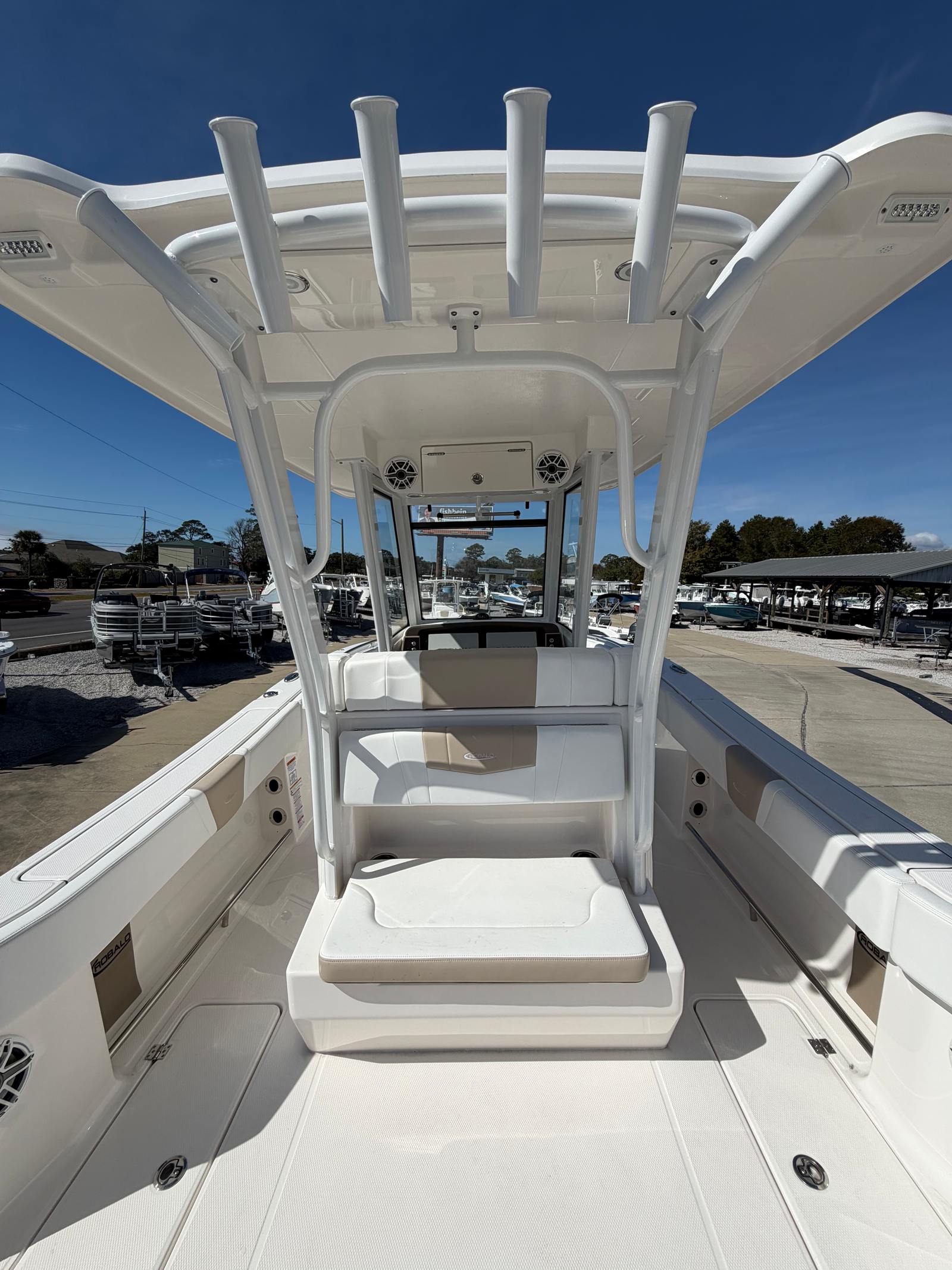 The 2026 Robalo 270 CC is a brand-new center console boat that measures an impressive 27.5 feet in length. This sleek vessel showcases Robalo’s commitment to quality craftsmanship and innovative design, making it a standout option in the competitive center console market. The white hull exudes modern elegance, while the sand-colored cockpit interior adds a touch of warmth and sophistication. Every detail of this boat is engineered for both performance and comfort, ensuring you get the most out of every outing.