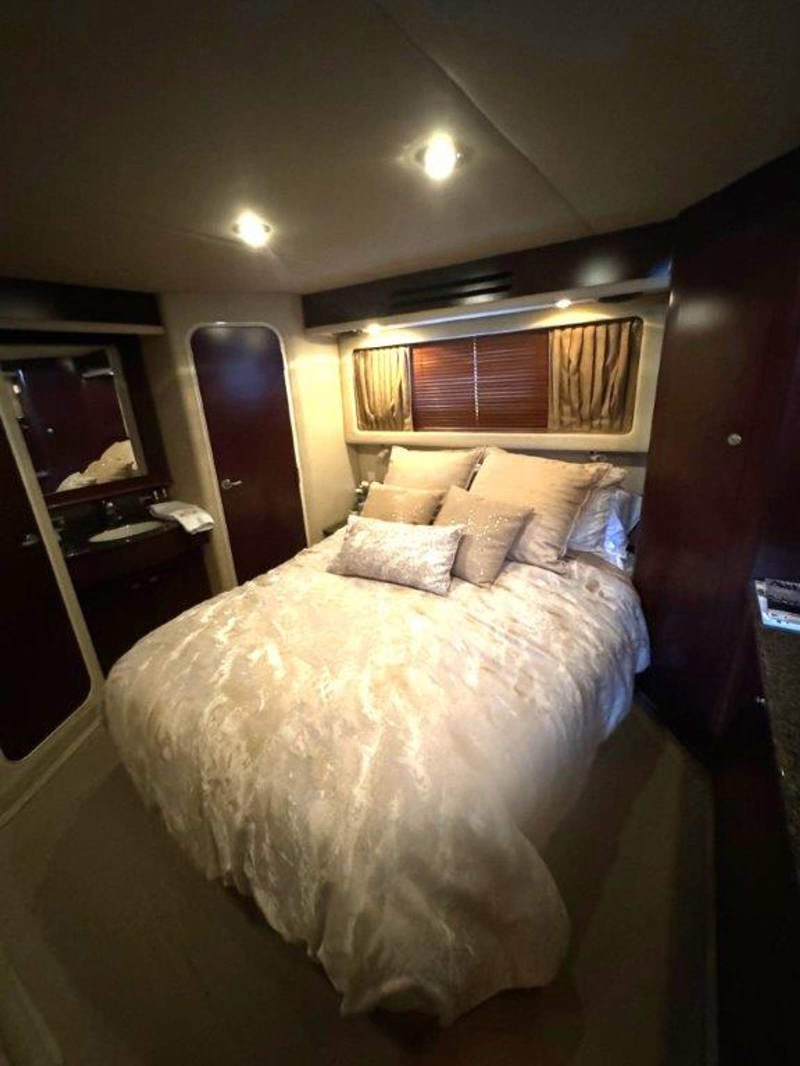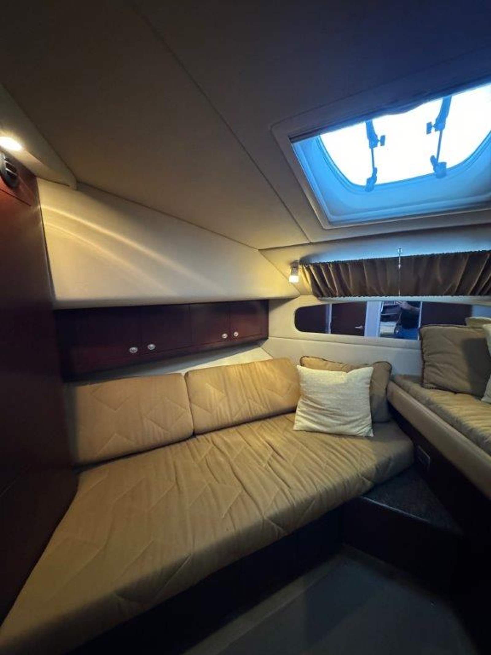 The salon is bright and open, perfect for entertaining, with a fully equipped galley that will please any onboard chef. Head up to the fully enclosed bridge, where A/C and heating let you cruise in comfort year-round — all while enjoying panoramic 360° views.