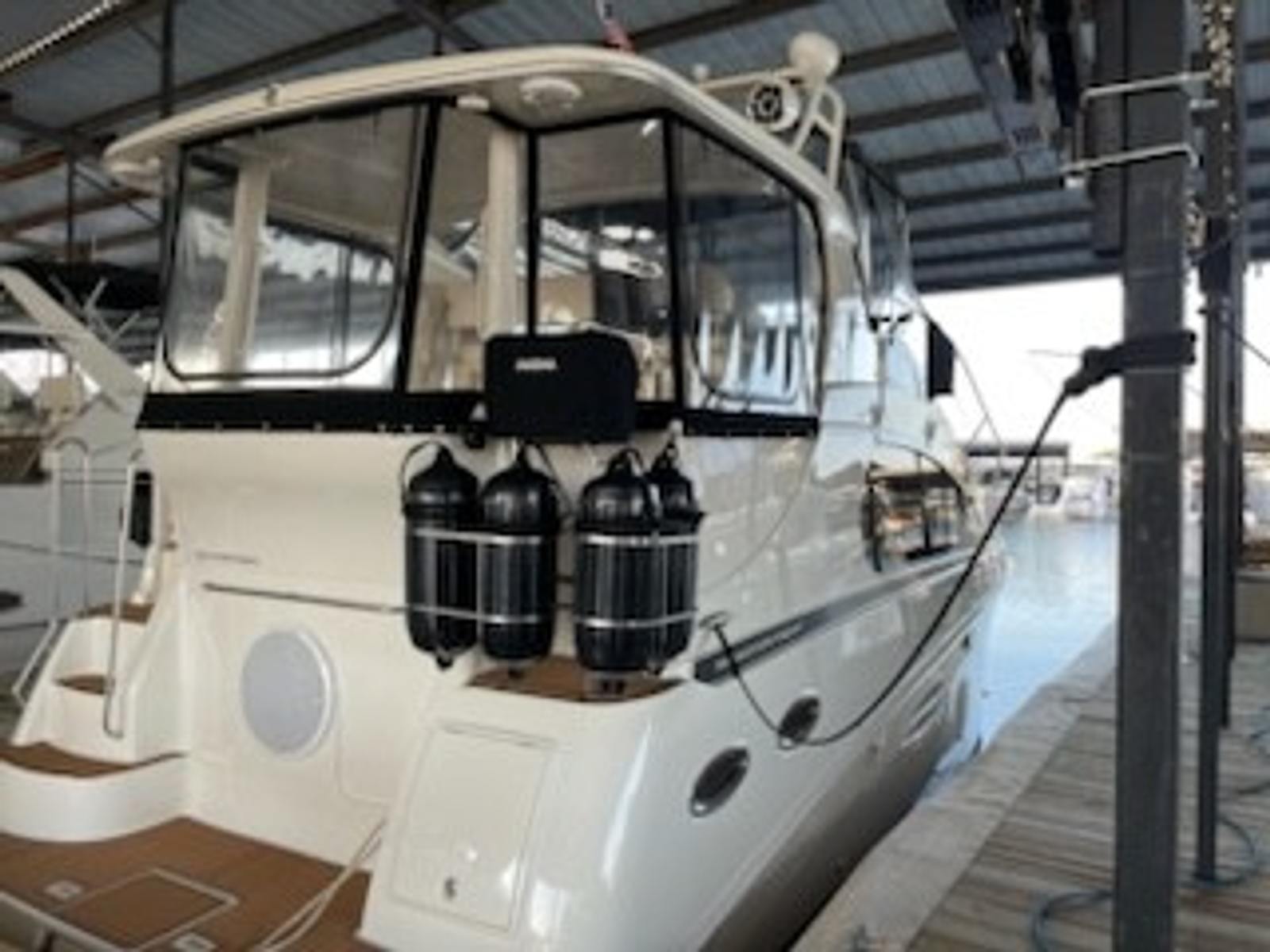 • Flybridge features full enclosure with black bimini top for comfort in all conditions