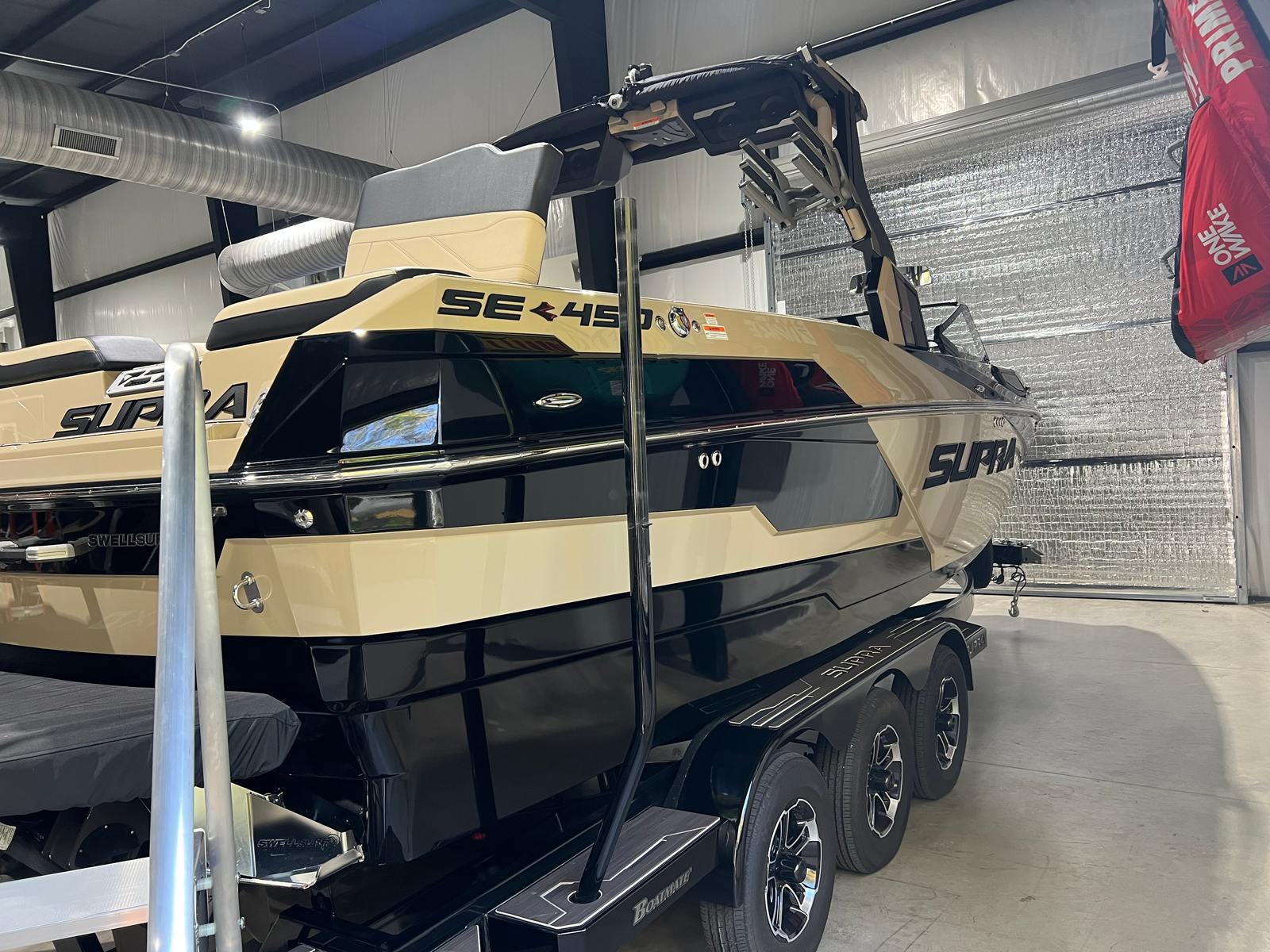 The Supra SE 450 is loaded with features designed to enhance your time on the water. Its spacious 24.5-foot layout provides plenty of room for friends, family, and all your water sports equipment. The boat’s sleek profile and modern styling are complemented by high-quality materials and attention to detail throughout the interior and exterior. Special features include a state-of-the-art wake system that allows you to customize the size and shape of your wakes, ensuring optimal conditions for every rider. The intuitive controls and ergonomic seating make operation effortless, while the advanced audio system lets you enjoy your favorite tunes as you cruise or ride.