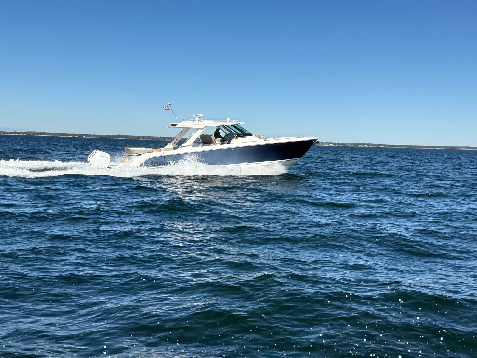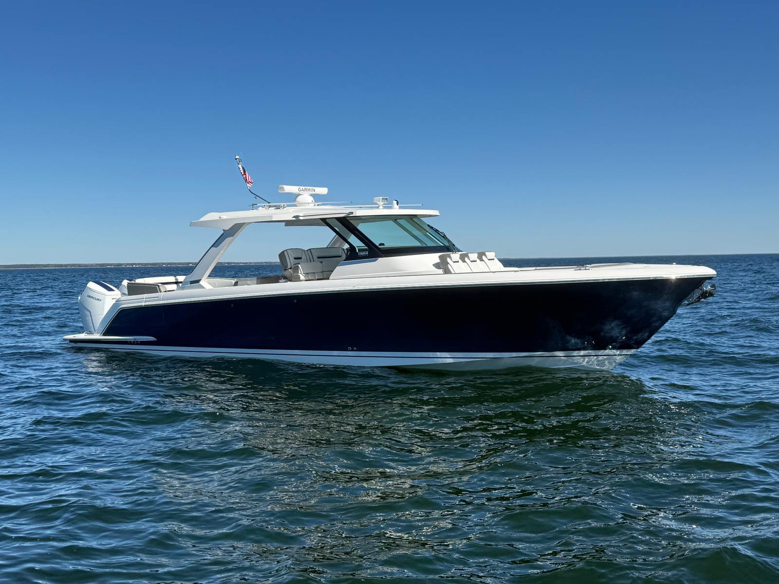 yacht with no wait time. Powered by twin Mercury 600hp V12 outboards with less than 80 hours, this vessel offers
